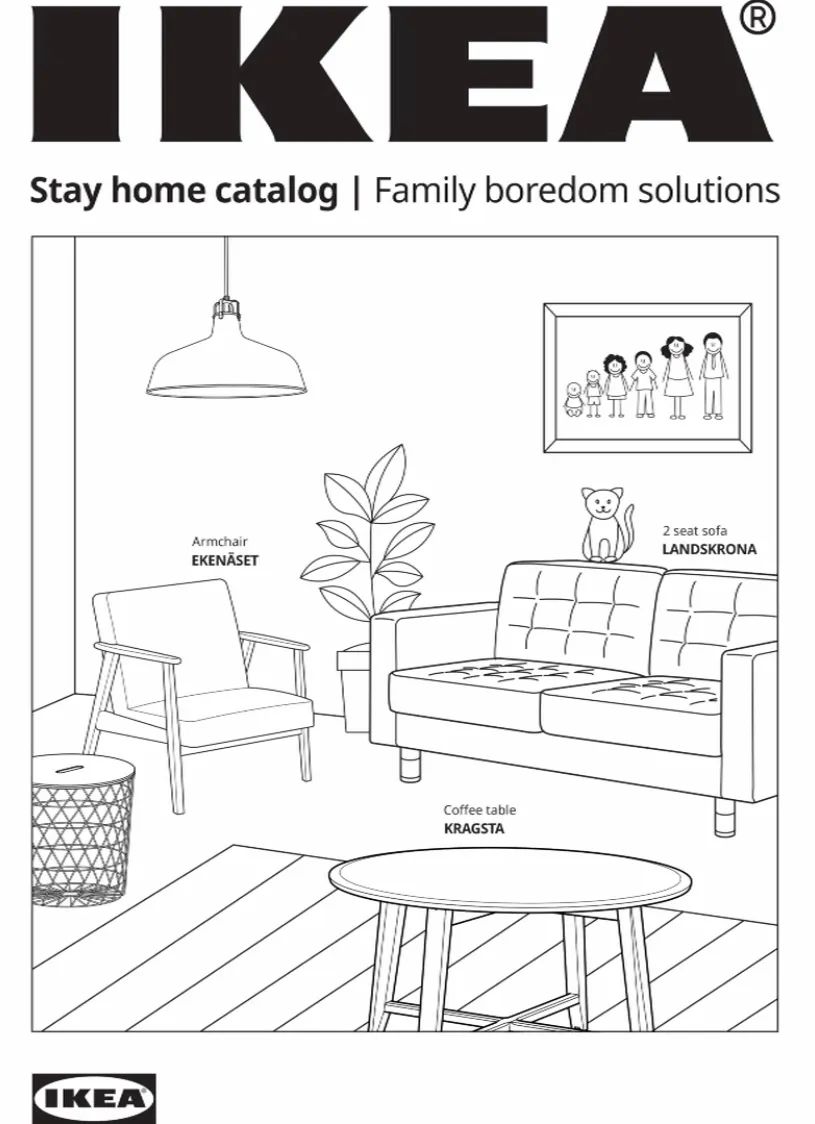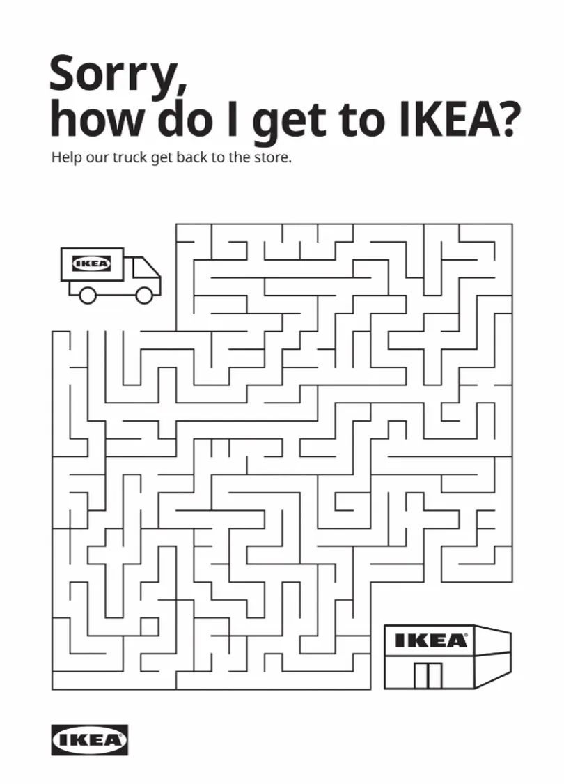 这是宜家为疫情宅在家的人们专门设计的,人们可以在宜家的说明书上玩 paper game,可以填色,可以走迷宫。