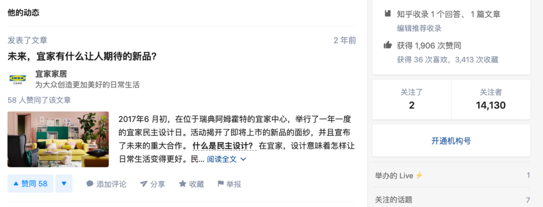 宜家是知乎上的热门关键词。 2017年宜家发表了两篇文章后,拥有14130名粉丝,ROI极高。