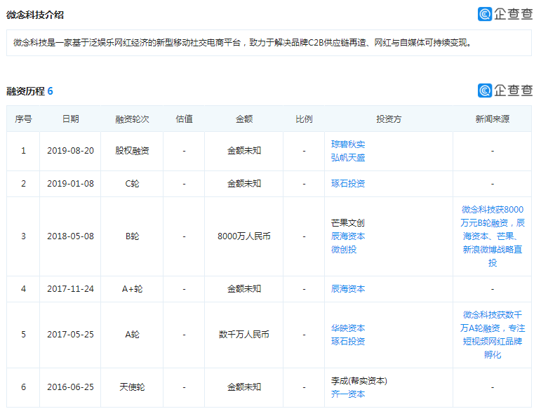 此外,李子柒的走红也离不开伯乐刘同明以及背后的MCN运营机构微念科技的商业和资本助力,创立于2013年的微念科技,曾是微博的12家核心合作伙伴之一,2018年完成B轮8000万元的融资,芒果文创、新浪微博成了新的战略投资方。据媒体披露,微念科技背后聚集了多达50家投资方,包括绿地控股、中兴通讯、新华传媒、万科、光线传媒等。