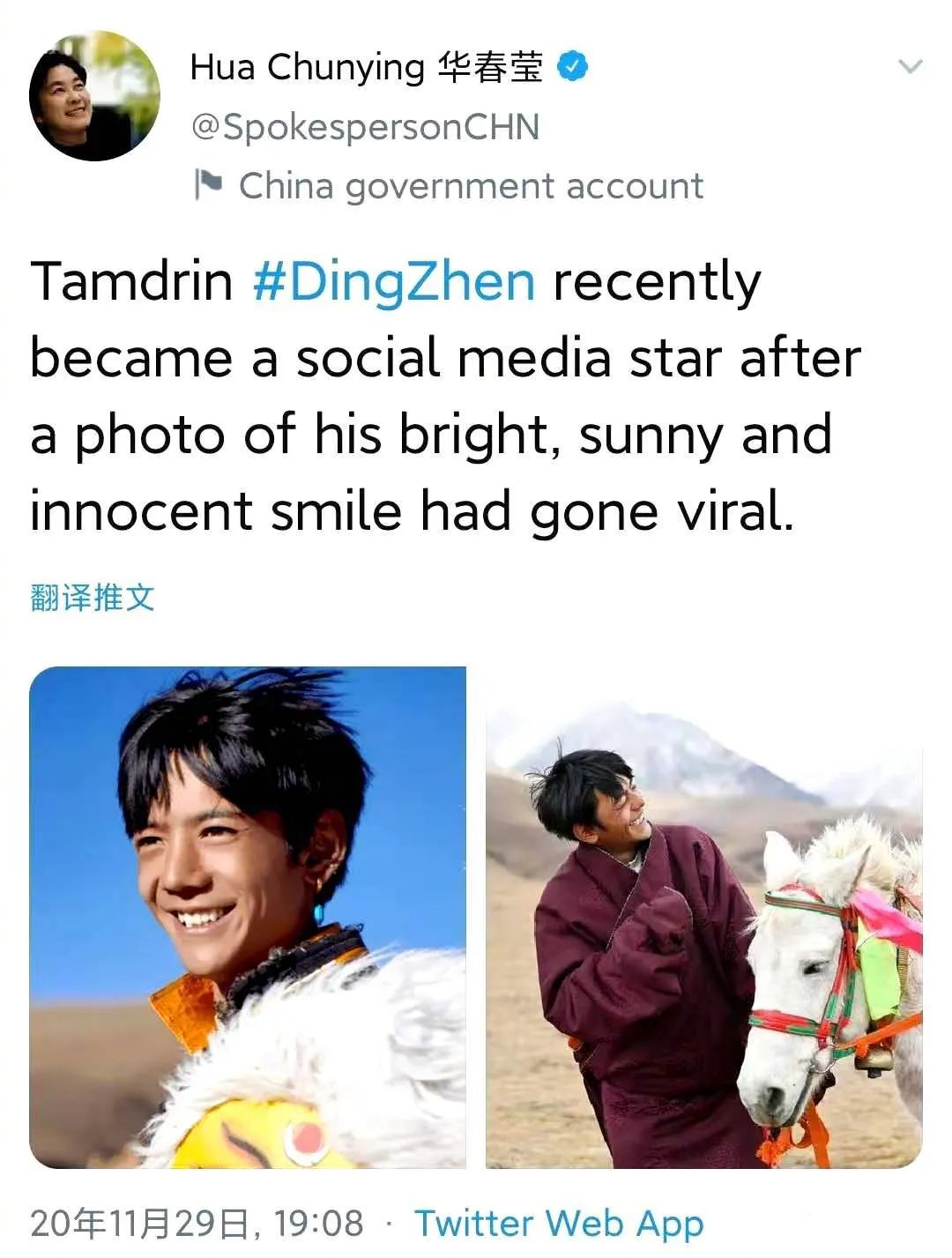 短短半个月后,他上了央视新闻,用藏语答,自己也不知道为什么会红。外交部发言人华春莹在推特上连发三条丁真相关推文,把他推向国际视野。