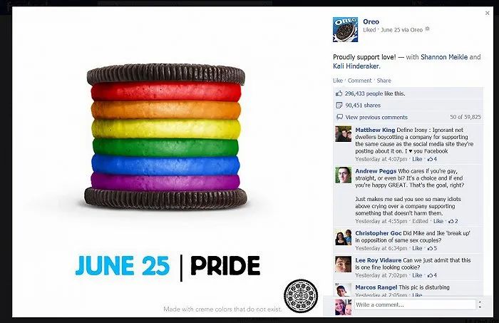 让品牌产品成为特定群体用户的“朋友”,其实也就是「产品社交化」。当讲求独特的年轻一代成为消费市场的主力,奥利奥也想方设法地借助社交网络出现在年轻消费者的视野之中,开始利用奥利奥饼干形象本身结合热点新闻事件来制造创意。比如为了支持“同性骄傲月”而制作出彩虹色的夹心层奥利奥就引发了大量的关注和讨论。