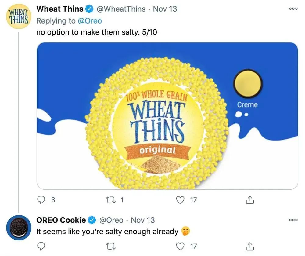 同为饼干品牌的 Wheat Thins 也来设计了一款「黄色奥利奥」,发文不忘吐槽一句「没有让它变咸的选项」。奥利奥也非常幽默地回了一句:「看起来你已经够咸了(偷笑)。」