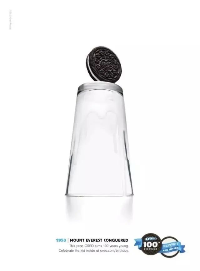 2012年,奥利奥专门为自己100周年设计的创意海报,更是社交网络营销战役中“一战成名”。1912年《白雪公主与七个小矮人》上映、1930年足球走上世界舞台、1953年人类登上珠峰、1969年人类登月成功……用创意的方式,让饼干和牛奶的组合回顾了过去100年重大历史事件。