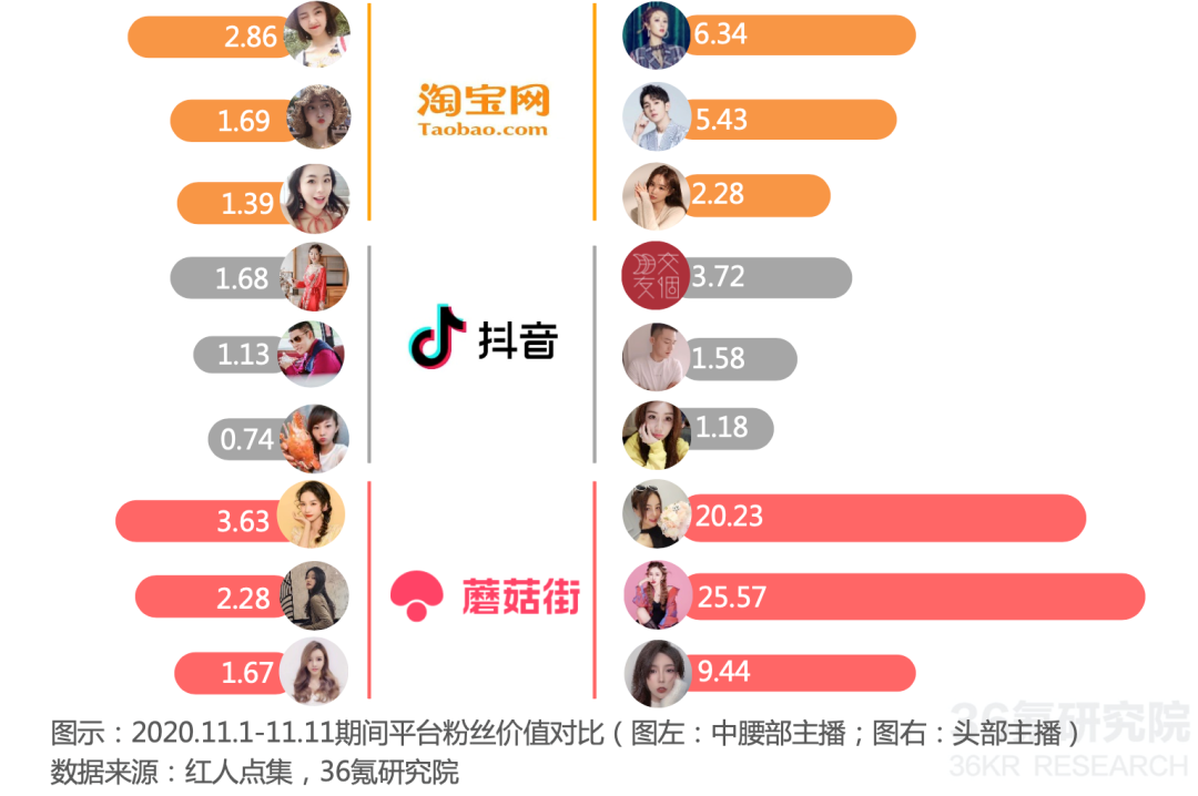 在36氪前不久发布的《2020年中国直播电商行业研究报告》中,36氪研究院选取淘宝、抖音、蘑菇街为三类平台代表,对2020.11.1-2020.11.11各平台头部、中腰部粉丝价值进行测算,发现: