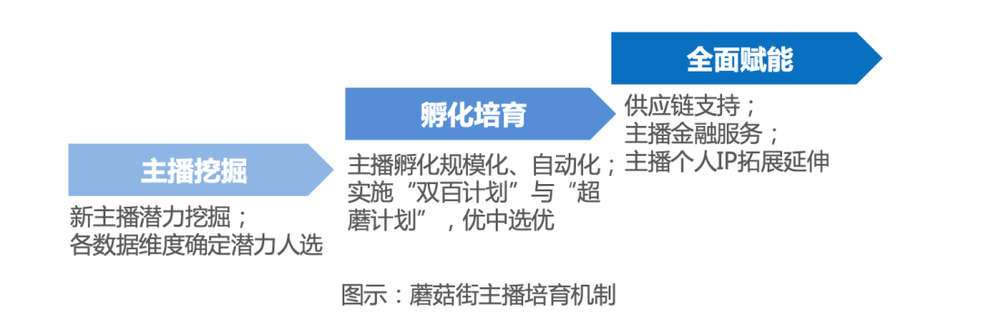 蘑菇街通过商品供应、孵化培训、软件工具、客户服务、金融支持等对主播进行全面赋能。