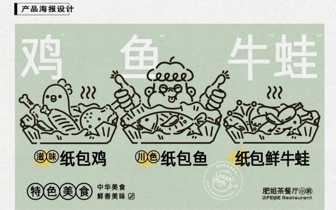 喜茶可能是一家如假包换的广告公司,不然为什么给别人做的海报都能这么好看呢?喜茶在其发源地江门以”隐食计划“为主题,为本地人熟知的4家老字号美食“肥姐茶餐厅、英伦美食、厚福粥粉面饭、孖宝点心王”做了一系列的设计。四家店,根据餐厅不同的招牌菜品选用了或中国风或卡通的不同风格,但是从字体以及色调的选择上又能从细节上看出喜茶一贯的审美路线。