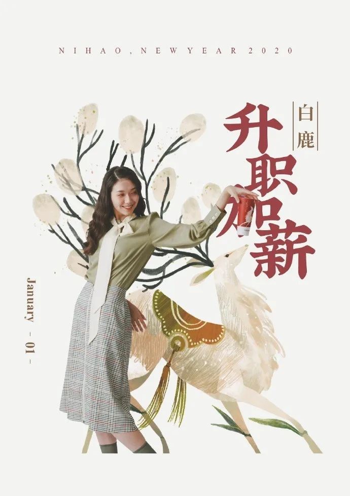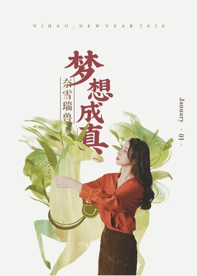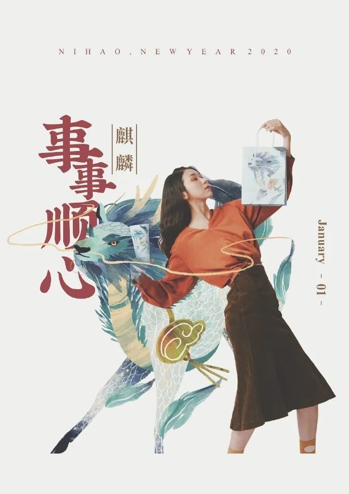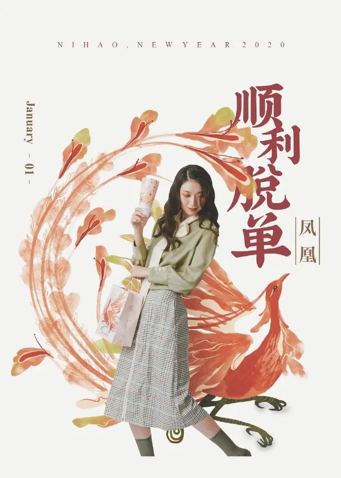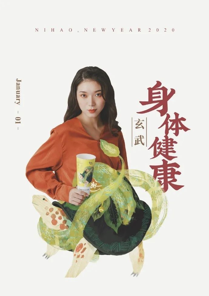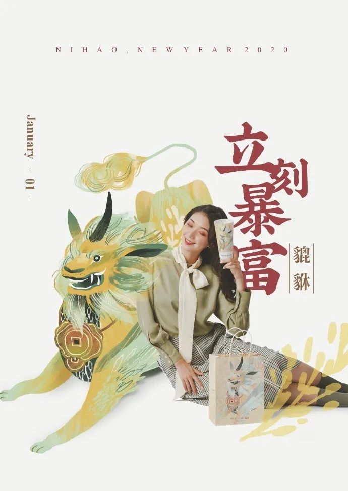 来自奈雪CUP美术馆第二期,也是时值新年推出的系列,艺术家Cinyee Chiu 创作的6只开运瑞兽,比如貔貅、凤凰、麒麟等都是大家熟知的带有美好的寓意神兽,因此也格外受人欢迎。与之前看到的中国风海报有所区别,这一系列的海报都采用真人实景的拍摄加上四字祝福语,整体设计风格更加清新淡雅。虽然没有强烈的色彩冲击,但依然不失为奈雪最为出圈的代表作之一。