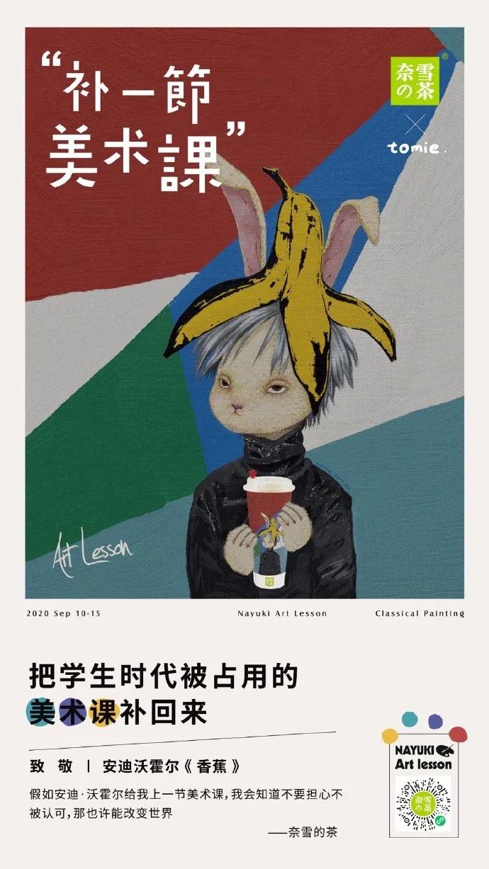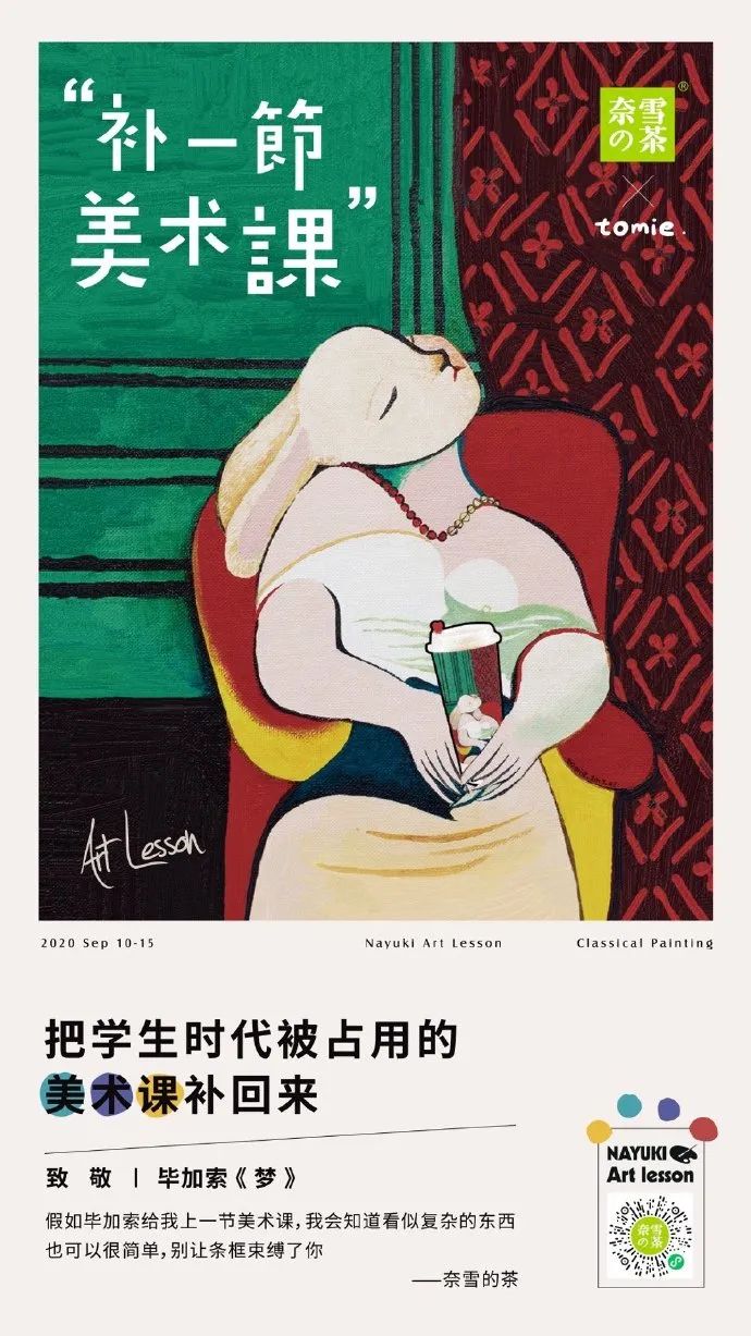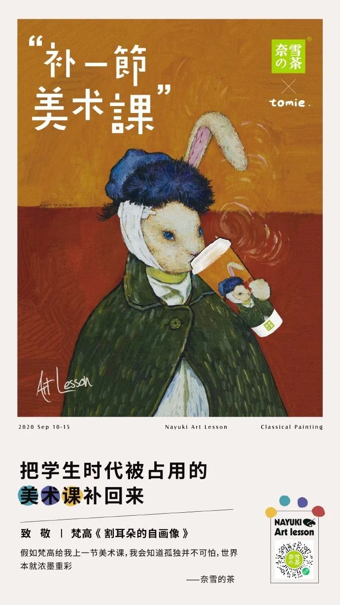 这系列的海报主题“补一节美术”是奈雪联合深圳市自闭症研究会发起的公益活动设计,在每一张海报里我们都可以看到绘画史上大师杰作的影子,梵高、毕加索、安迪霍沃尔……这些海报似乎回答了一个问题:如果大师喝奶茶会是什么样子的?这个创意实在是太有趣了。