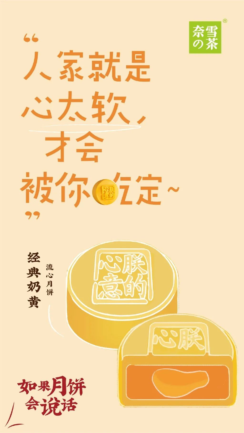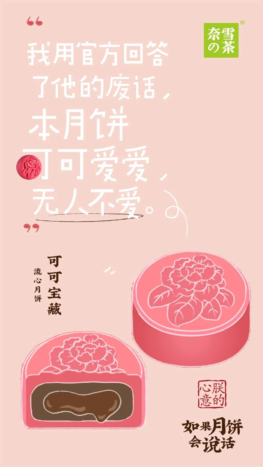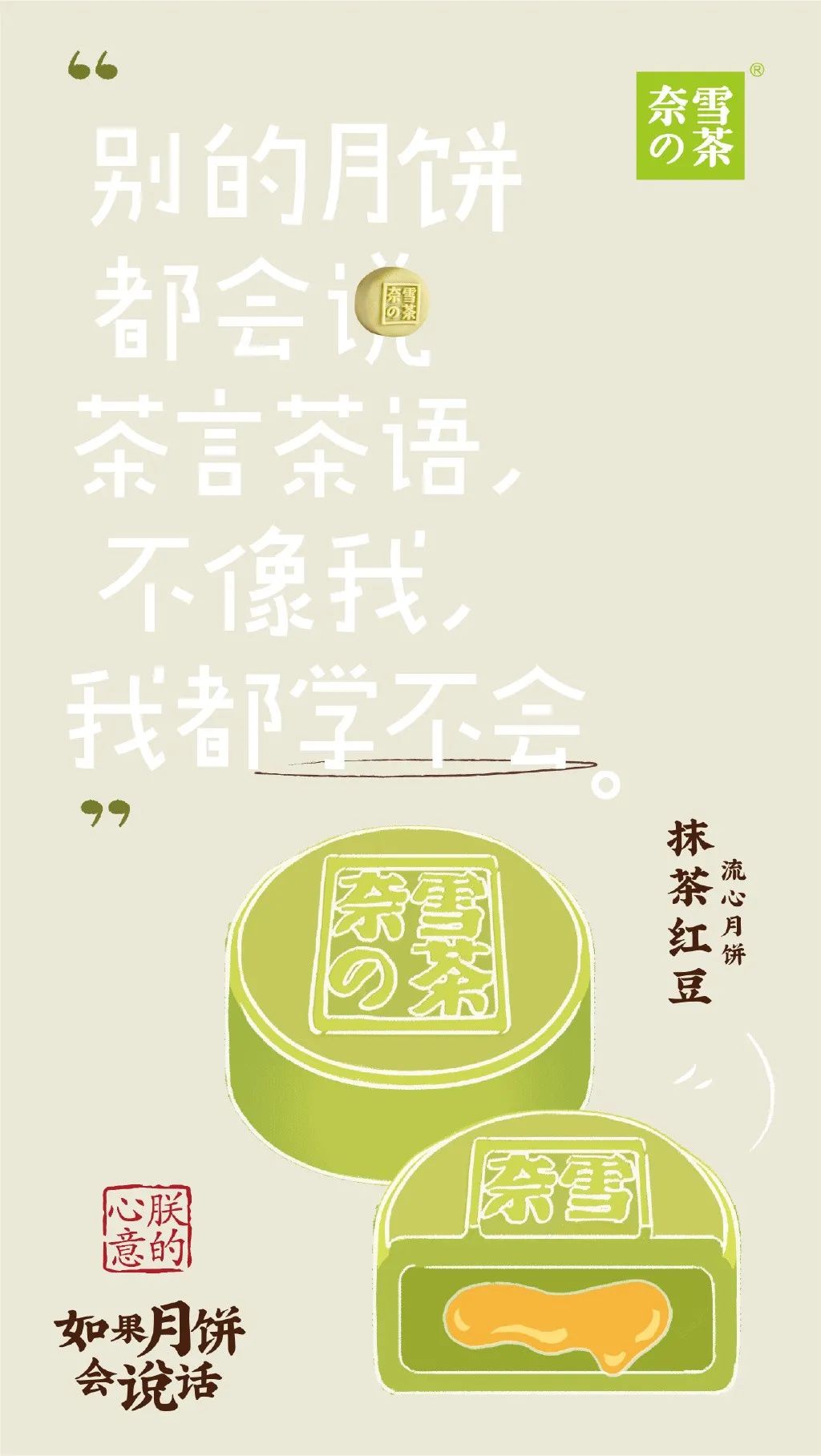 依旧是故宫联名,但相比乐乐茶与故宫的合作海报就要稍微”隐晦“一些。主视觉的重点不在画面而在文案上。使用了芋泥-与你,抹茶-茶颜茶语,可可宝藏-可可爱爱等较多谐音梗,还有“如果月饼会说话”则使用了之前大热的故宫纪录片《如果国宝会说话》的主题。虽然没有那么直白,但正是这种恰到好处的“内涵”更易博得文艺青年们的会心一笑啊。
