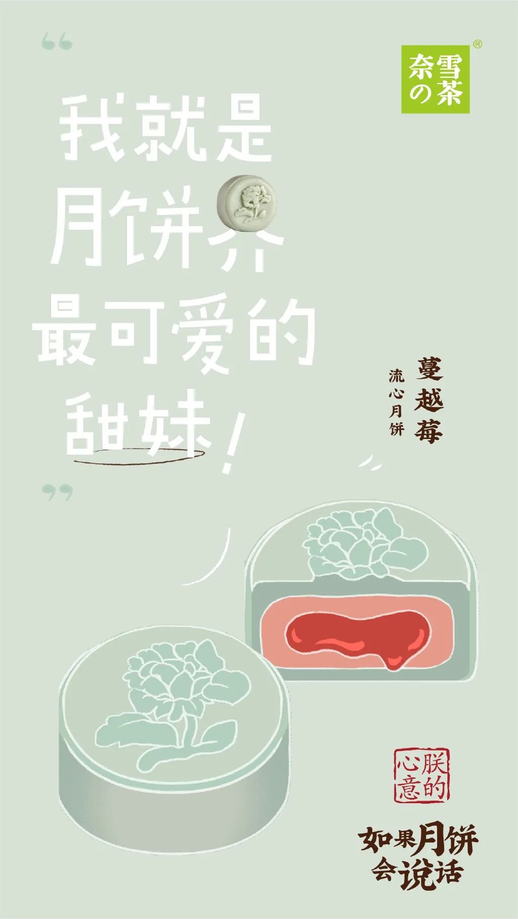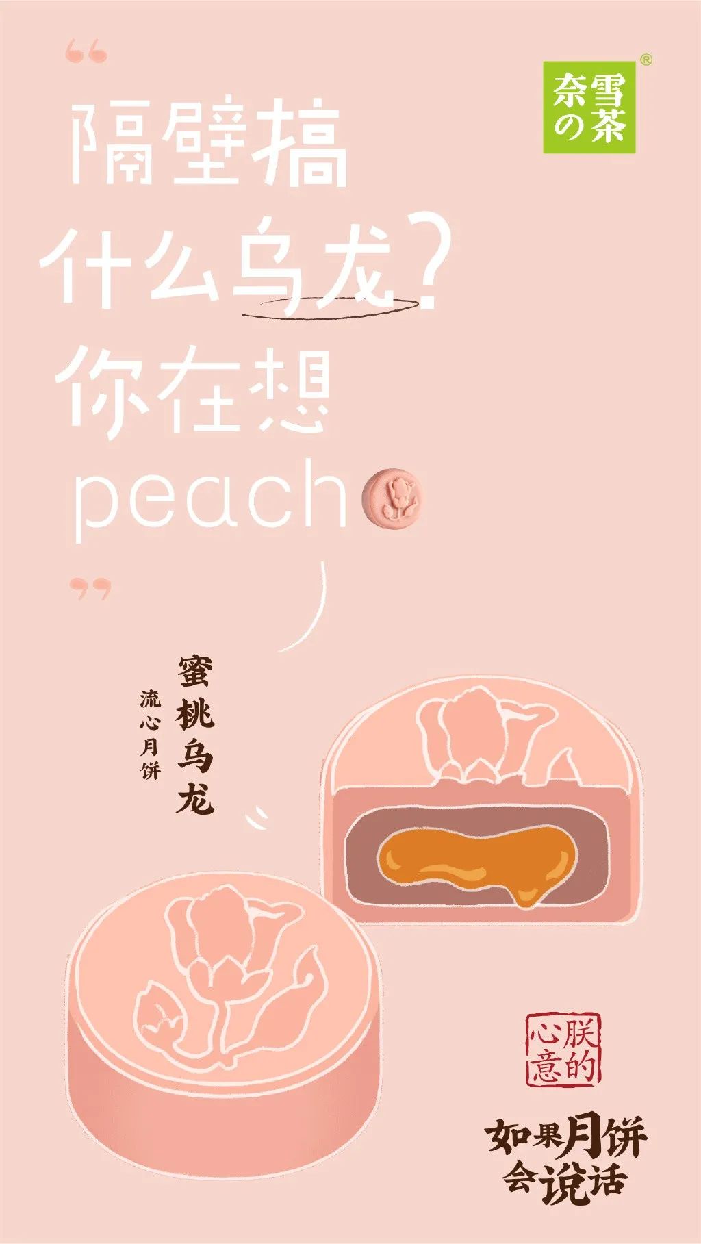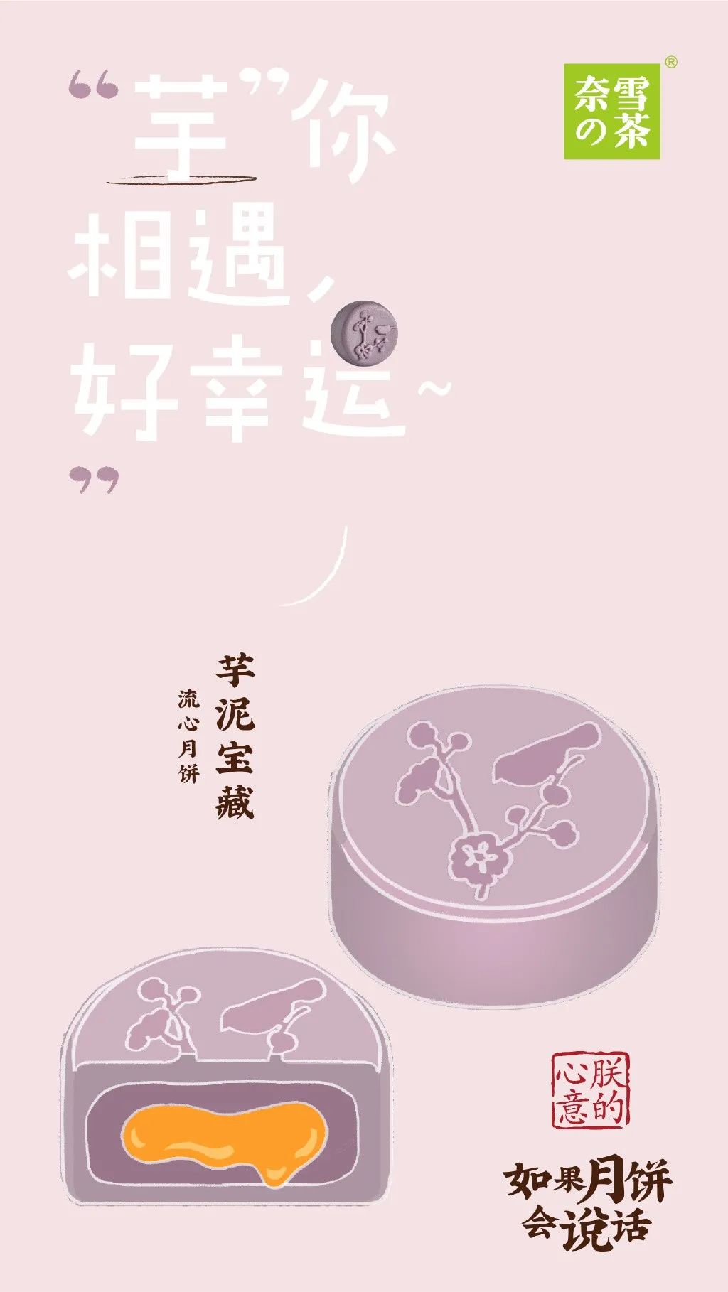 依旧是故宫联名,但相比乐乐茶与故宫的合作海报就要稍微”隐晦“一些。主视觉的重点不在画面而在文案上。使用了芋泥-与你,抹茶-茶颜茶语,可可宝藏-可可爱爱等较多谐音梗,还有“如果月饼会说话”则使用了之前大热的故宫纪录片《如果国宝会说话》的主题。虽然没有那么直白,但正是这种恰到好处的“内涵”更易博得文艺青年们的会心一笑啊。