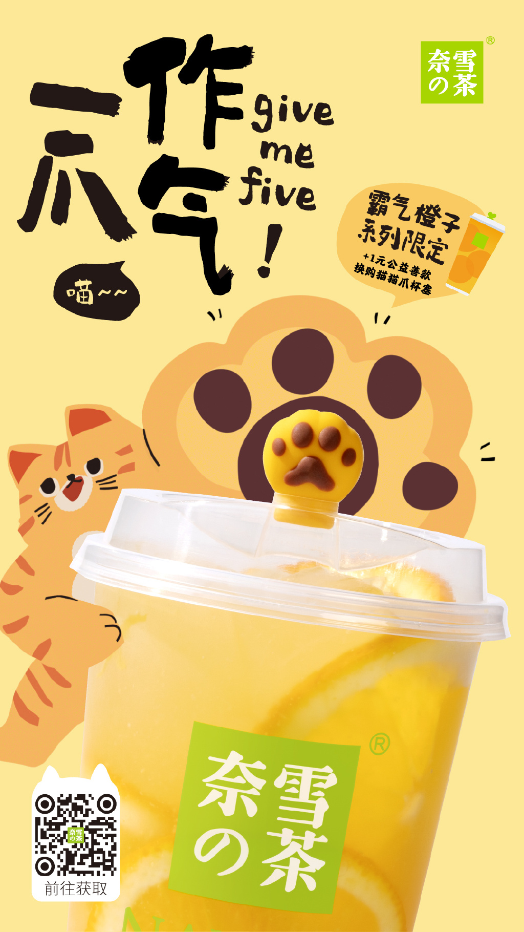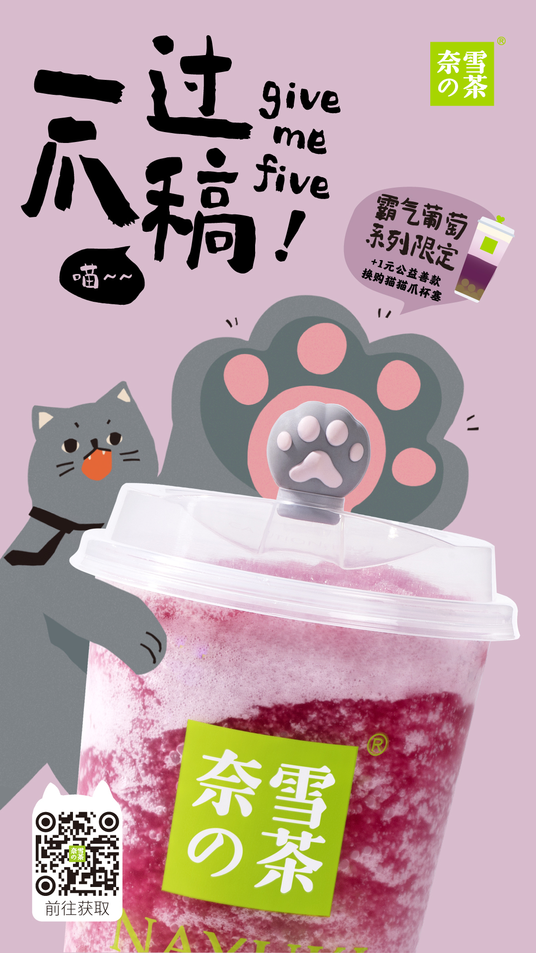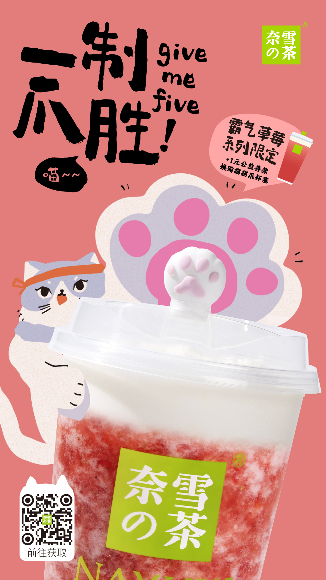 配合奈雪的茶猫爪型杯塞推出的系列海报,用儿童画般的笔触画出软萌的猫爪,是不是下一秒就想去撸猫了?海报文案也非常有趣,虽然每张都只有短短四个字,但都可以称得上是短小精悍,分别是“一爪作气、一爪制胜、一爪过稿”,特别是最后一张“一爪过稿”,简直击中每一个乙方的心声啊。
