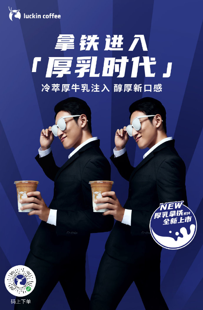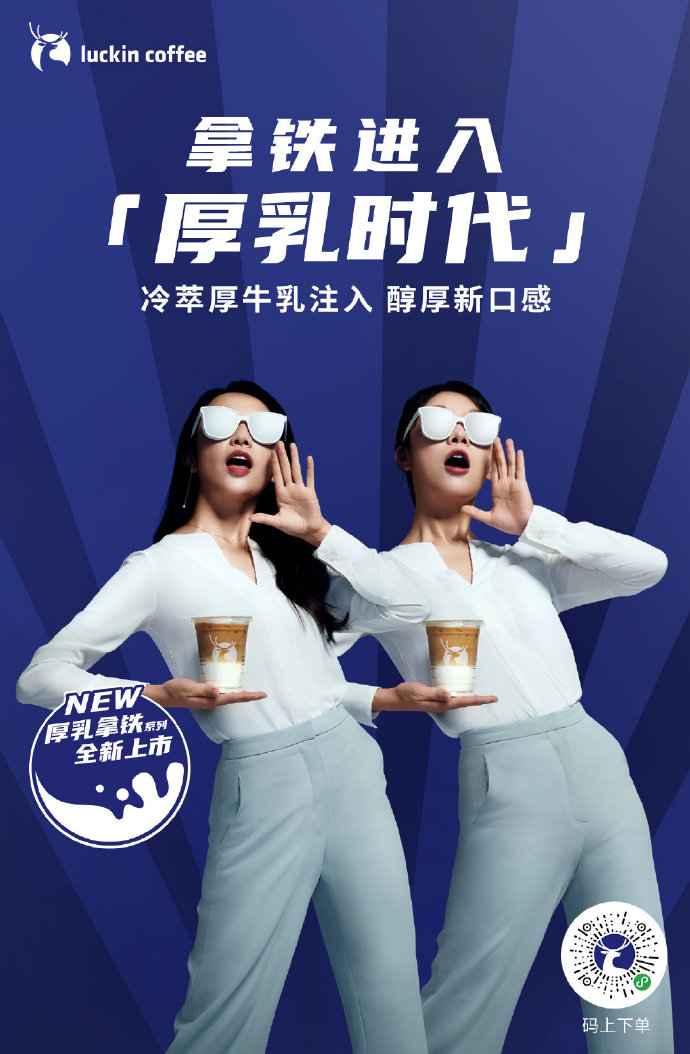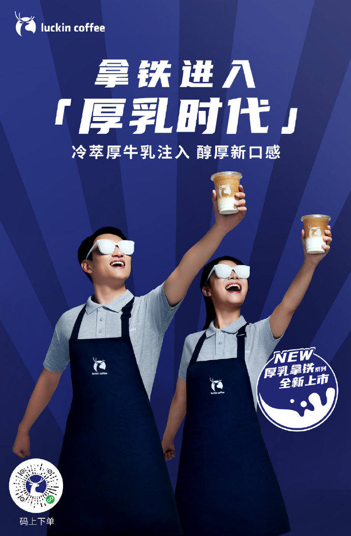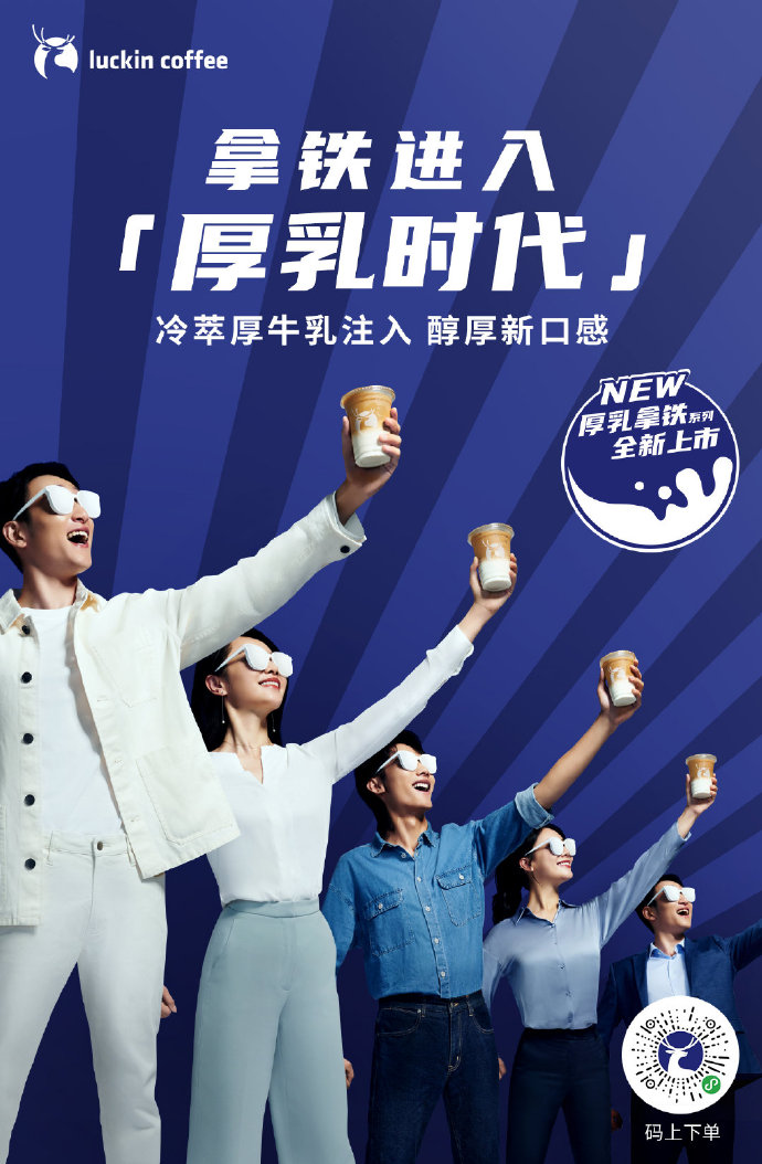 厚乳拿铁应该是瑞幸最受欢迎的产品之一了吧。系列海报为不同人数戴着银色墨镜的年轻人,共同举杯的形象。有点后现代的意味,一张张海报又像是不断加重语气不断重复的洗脑广告词,略显魔性。