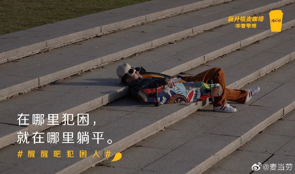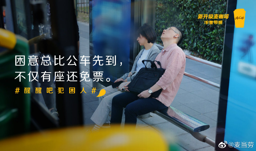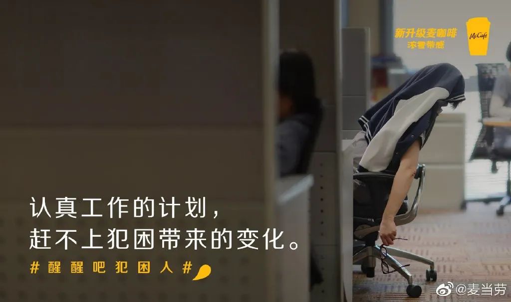 11月18日,McCafé麦咖啡产品全面升级,为此麦当劳以“醒醒吧犯困人”为主题推出系列海报。每一张kv画面都是困得“不省人事”的年轻人,虽然构图简单,但配上过于真实的文案,让人不禁下一秒就噗嗤笑出声来,不仅麦咖啡浓香带感,连海报都很带感啊!