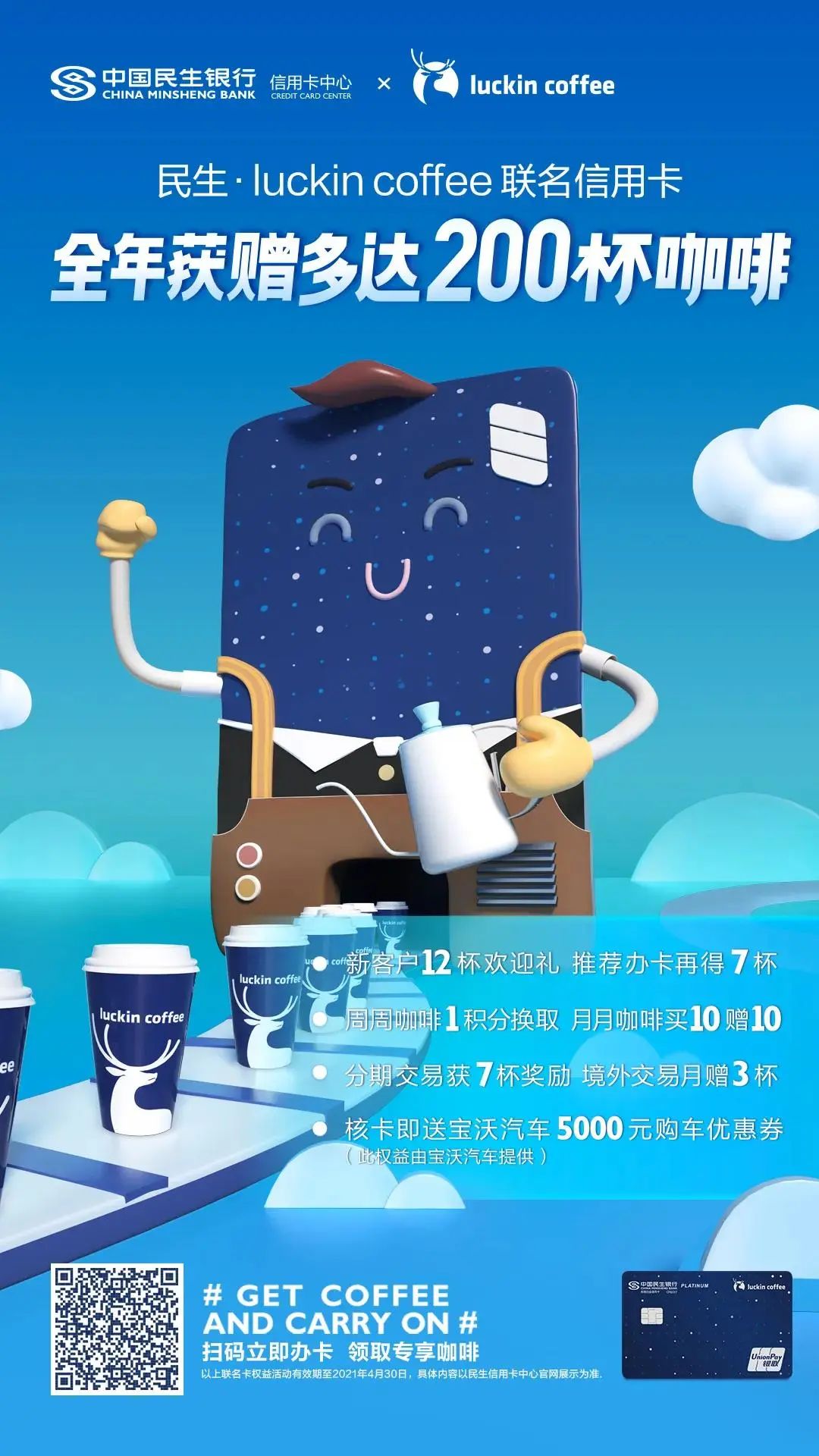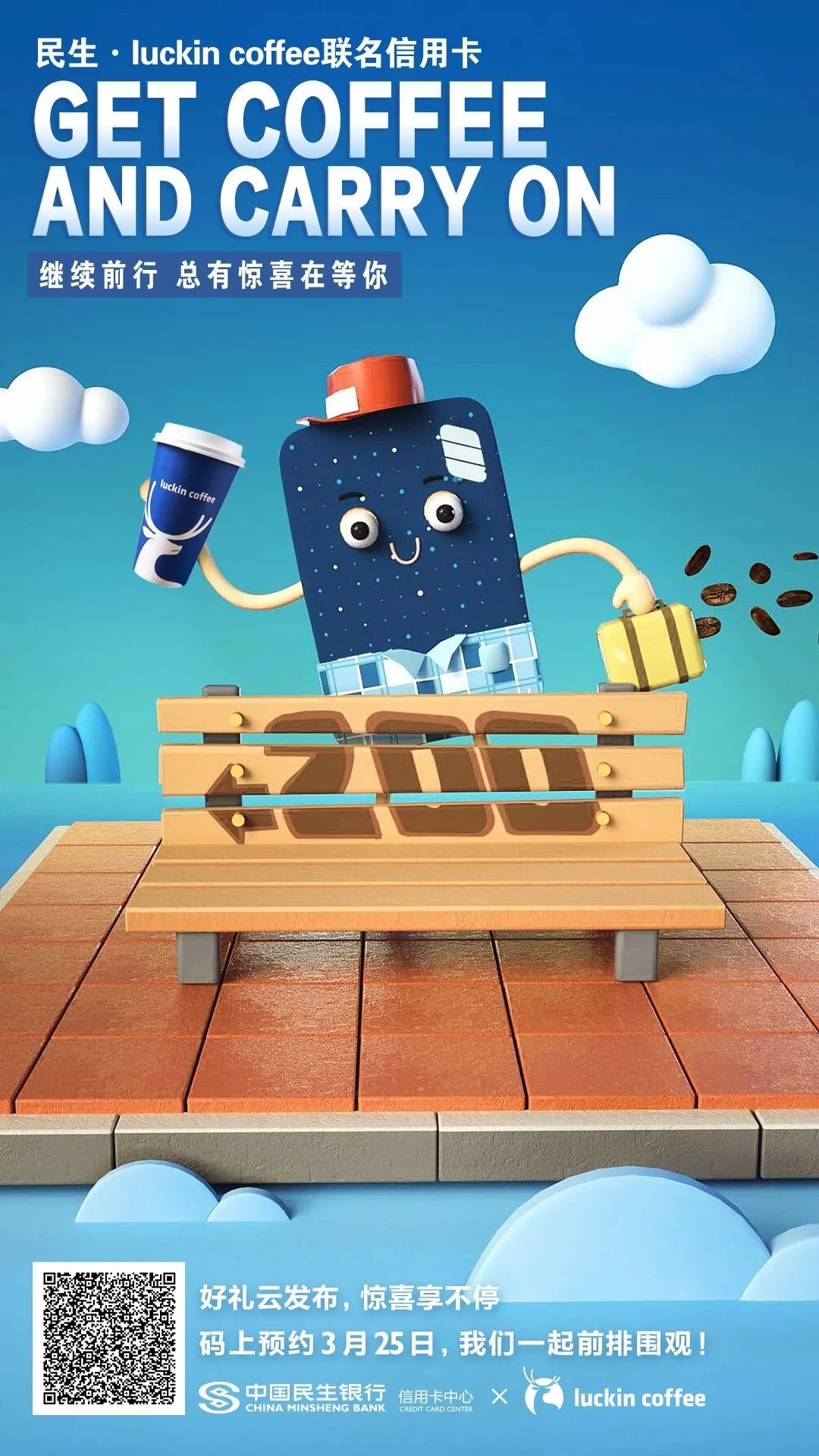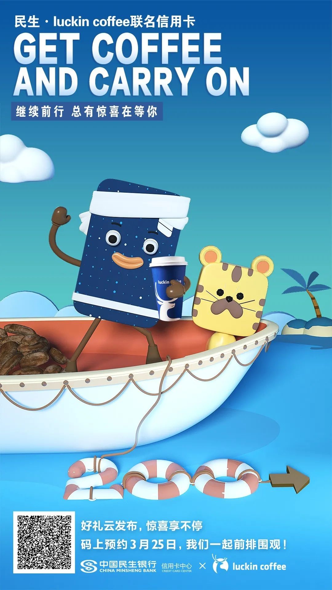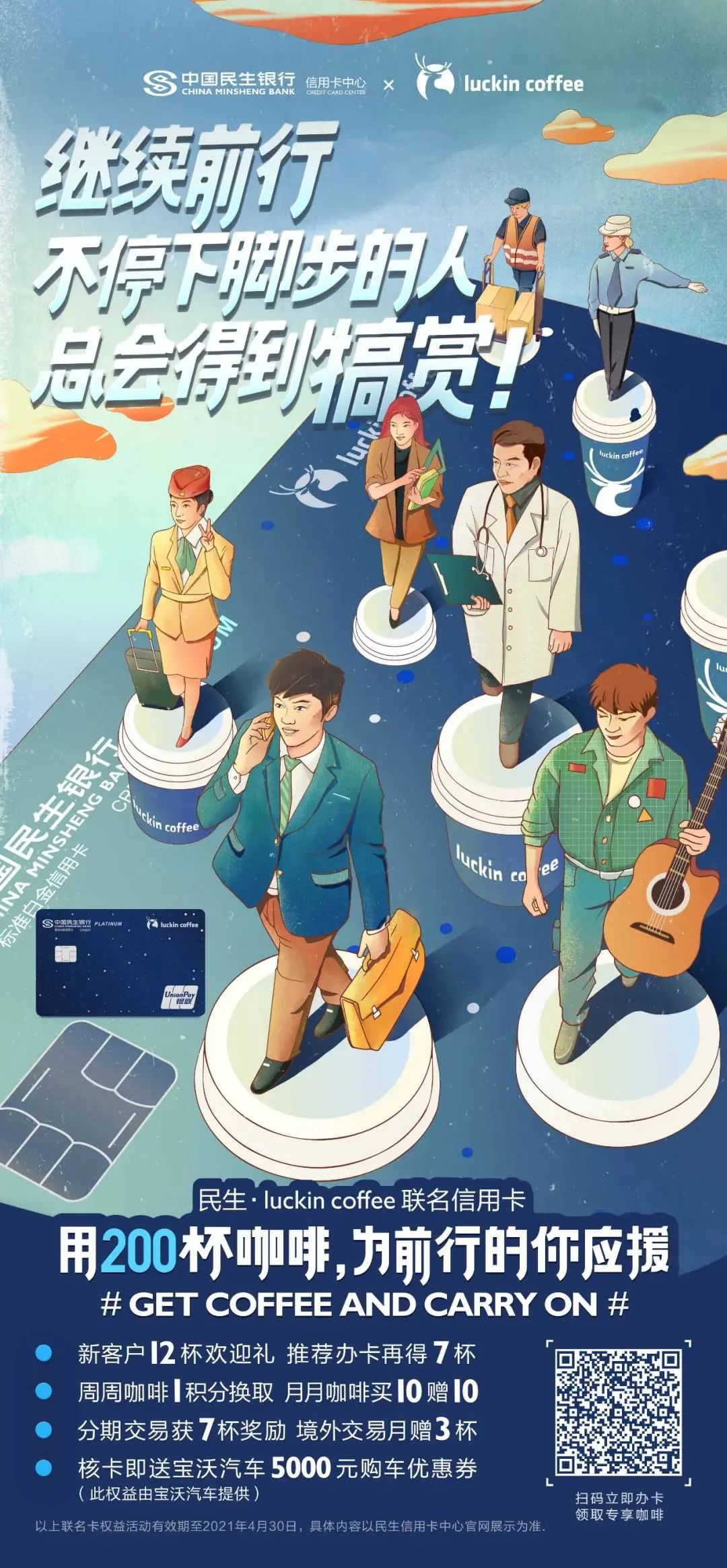 来自今年3月民生与luckin coffee联名信用卡,营销主题是用200杯咖啡陪你继续前行。改编自二战时期英国首相丘吉尔的经典名句Keep calm and Carry on(保持冷静 继续前行)的主题。后疫情时期的3月,全国处于复工阶段,在主题文字上“Get coffee and Carry on”精准地抓住了“前行”这一关键点。画面形象则重新创作了一路向前的少年派和不断奔跑的阿甘,可可爱爱也温情不断。