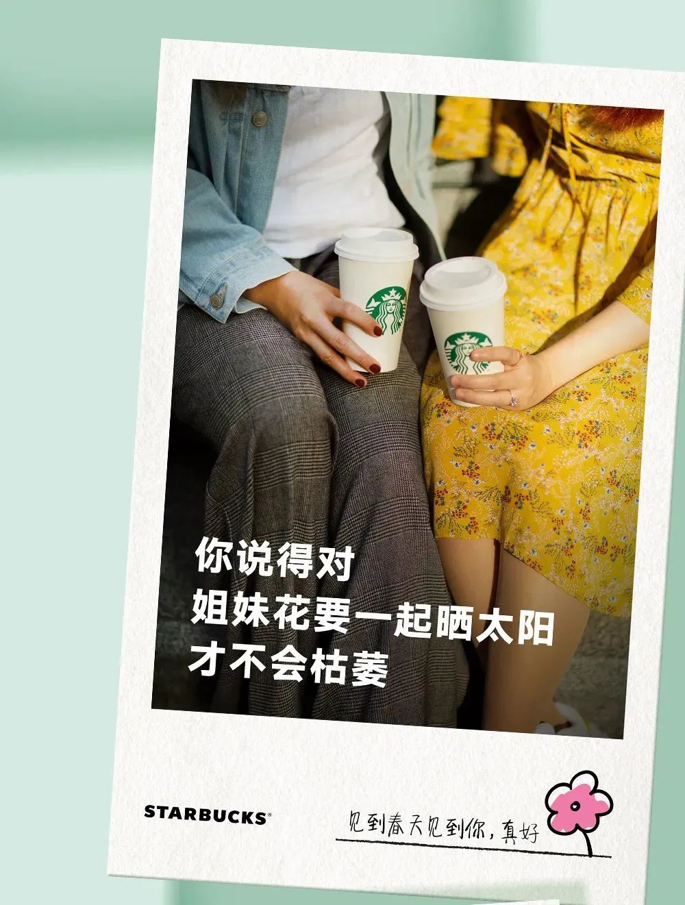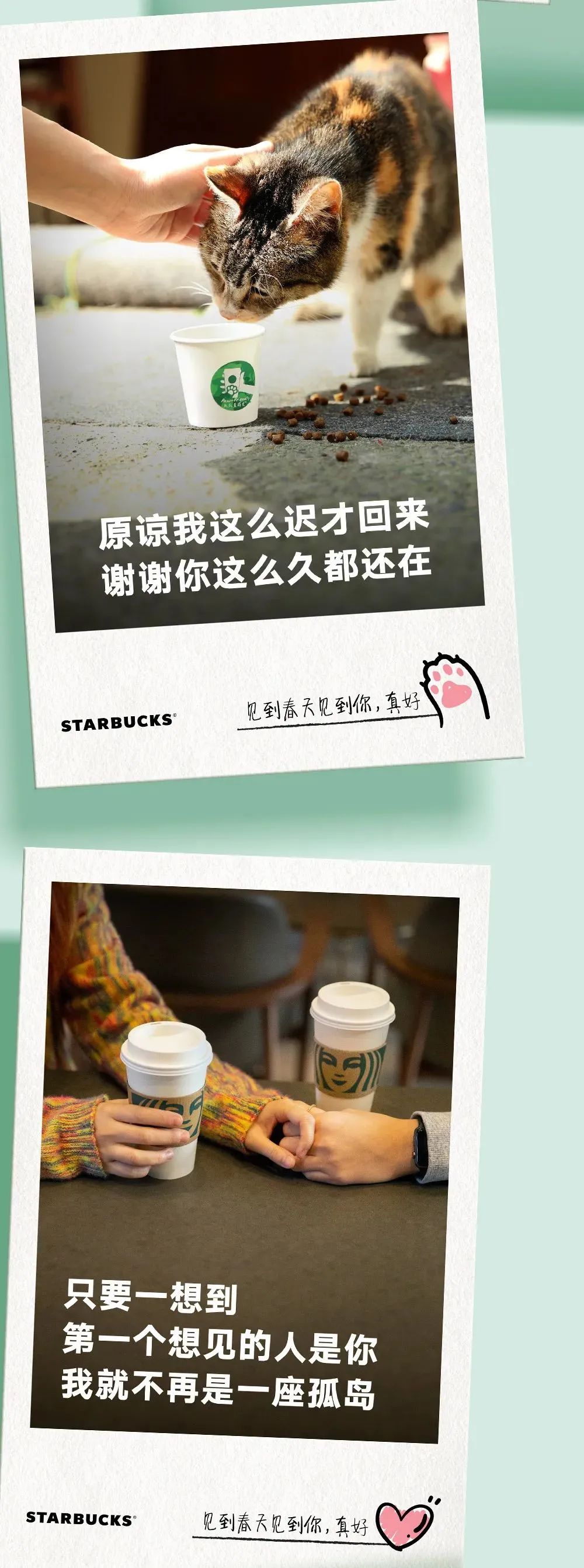 这是星巴克在3月初发起一波以“见到春天见到你,真好”为主题的品牌战役海报。同样也是在疫情期间,鼓励人们迎接春天和希望,星巴克会与你一直在一起。比色彩更加明快的,是每张海报的文案,正如我们常说的那句:没有一个春天不会到来。特殊时期,更能体现品牌温度。