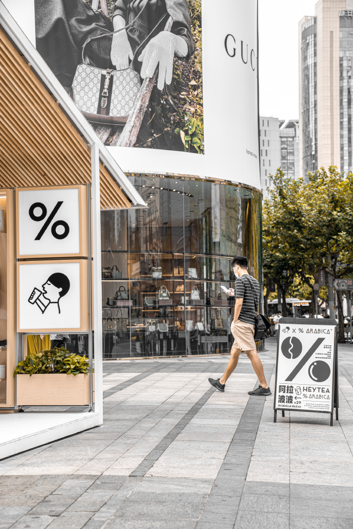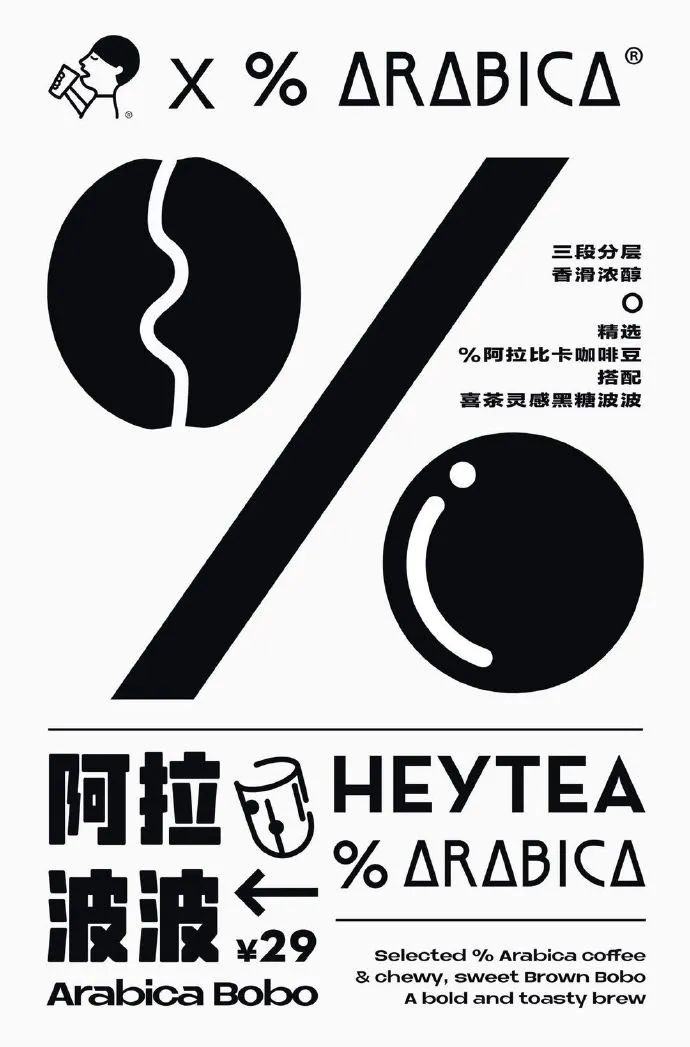 Arabica Coffee与喜茶的联名,虽然只有一张海报,但却足够让人过目不忘。海报元素分别选取了喜茶与Arabica Coffee最具代表性的“波波”和百分比符号,将两者结合,同时色调上保留了波波的黑色和Arabica Coffee经典的原木色,除了海报设计,线下活动案场的物料设计也延续了这一风格,可以说是结合完美的品牌联名典范。