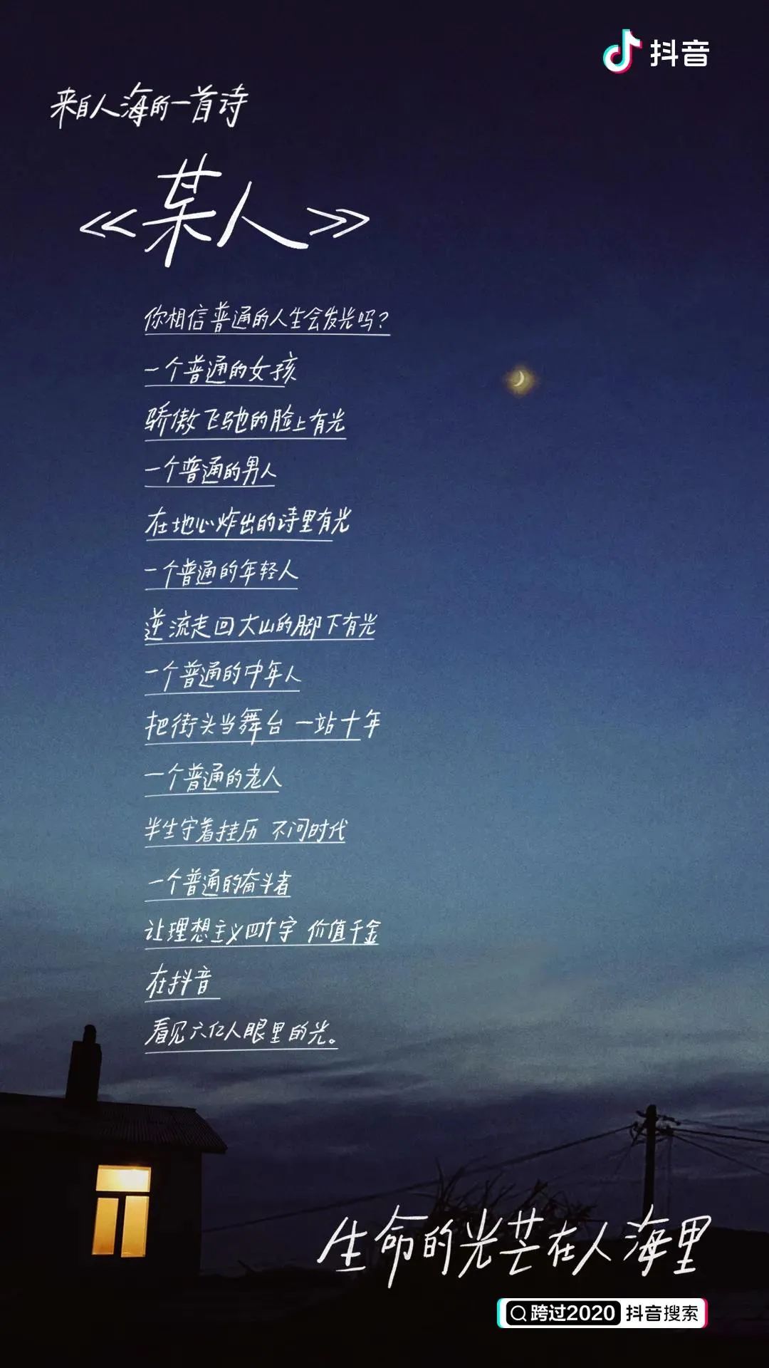 2020年流行价值观营销,抖音的主角选择和文案内容,估计也是希望以低姿态的视角切入和大众达成共鸣,从“普通”这个词贯穿所有海报文案就可以看到这一点。一个普通的年轻人、一个普通的老人、一个普通的女孩……“生命的光芒在人海里”,抖音把他们找出来呈现在观众面前。