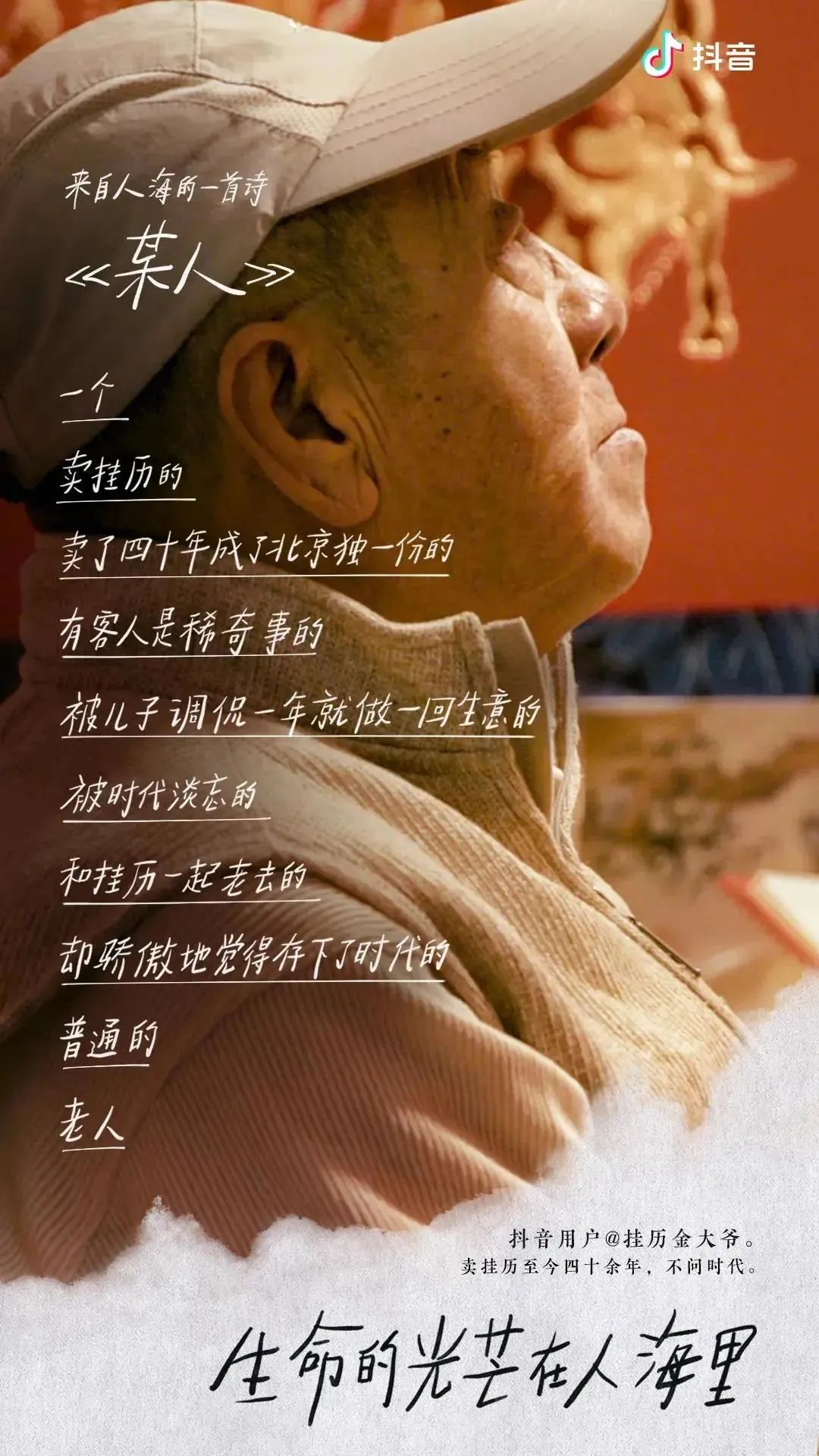 抖音这次选中5位用户的分别是矿工诗人-陈年喜、栋笃笑街头艺人-钟永明、卖了40年挂历的老人-金安光、东北返乡创业青年-胡杨、喜欢骑机车送外卖的年轻女孩-小蔡,他们最大的共同特点或许就是“普通人”,不是明星、网红、官员或者霸道总裁。
