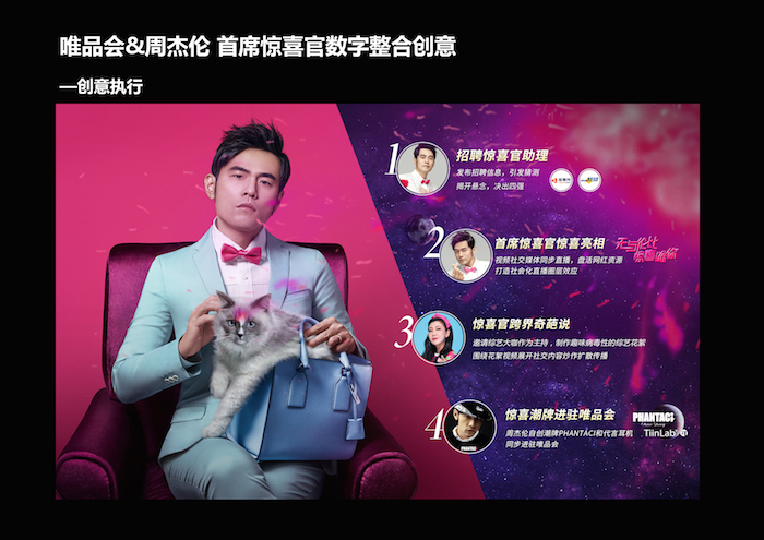 2016年,唯品会宣布周杰伦成为“首席惊喜官”,随后又找来昆凌做代言人。与此同时,唯品会还引入了高圆圆、庾澄庆、郑恺、孙坚等明星和张驰、李薇等设计师的原创品牌,并上线了“原创视频+导购直播”的原创视频节目《唯品美美搭》,造势声量颇大。特别的是,即便是已有周杰伦坐镇,唯品会也依然不忘拉上大热网综《奇葩说》中的热门选手与之互动。