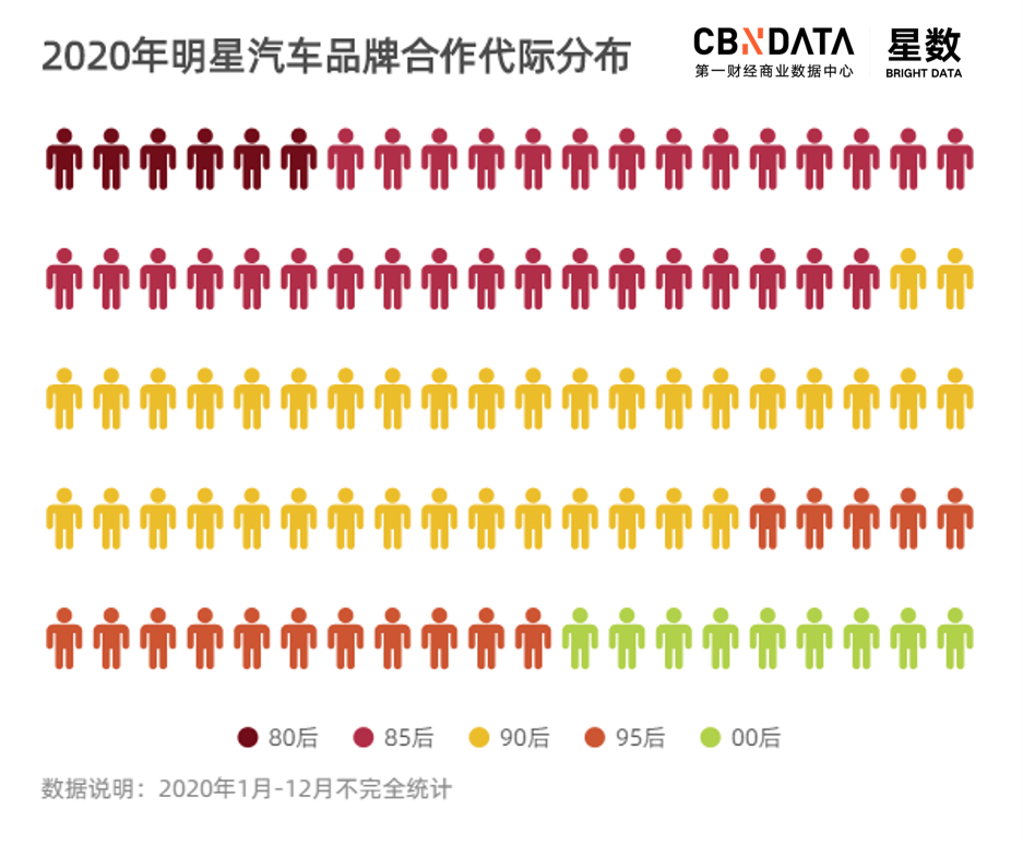 90后用户对于汽车内容的关注逐步攀升,汽车品牌为了打开年轻消费者的市场,开始招揽更多的新生代明星入场。据CBNData星数不完全统计,2020年明星汽车代言达到46起,比2019年上升76%。其中,在代际分布上,90后明星已经占据了汽车代言的半壁江山。