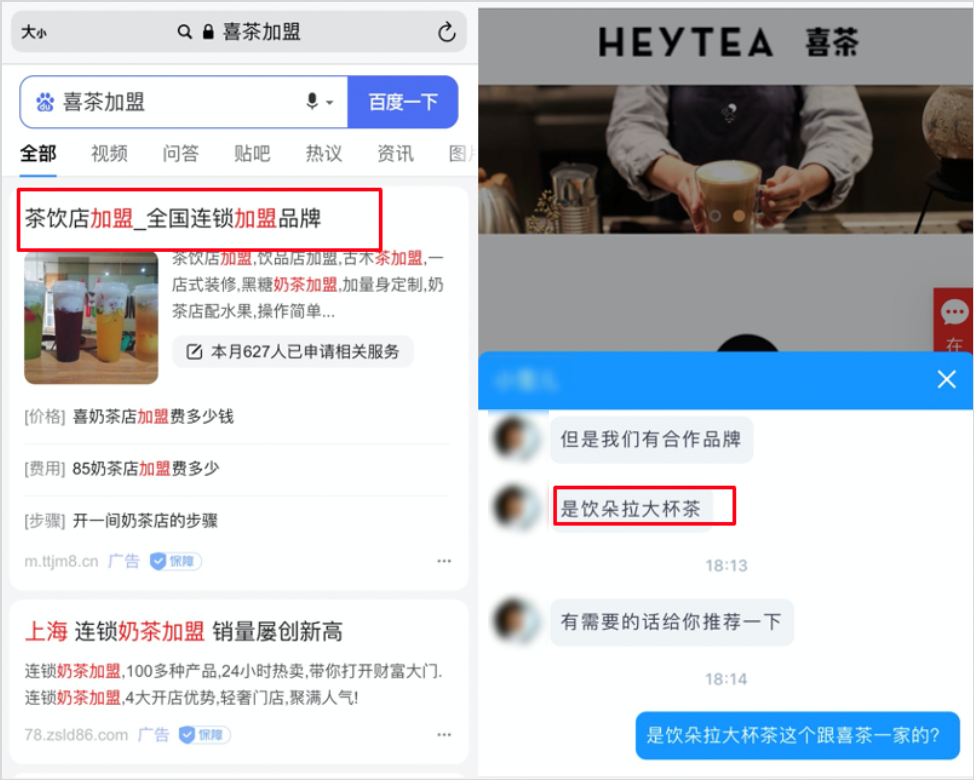随手搜索到一家声称“喜茶加盟”的代理商,刚跟客服聊几句就发现不对劲: “喜茶”咋还变成了“饮朵拉大杯茶”?