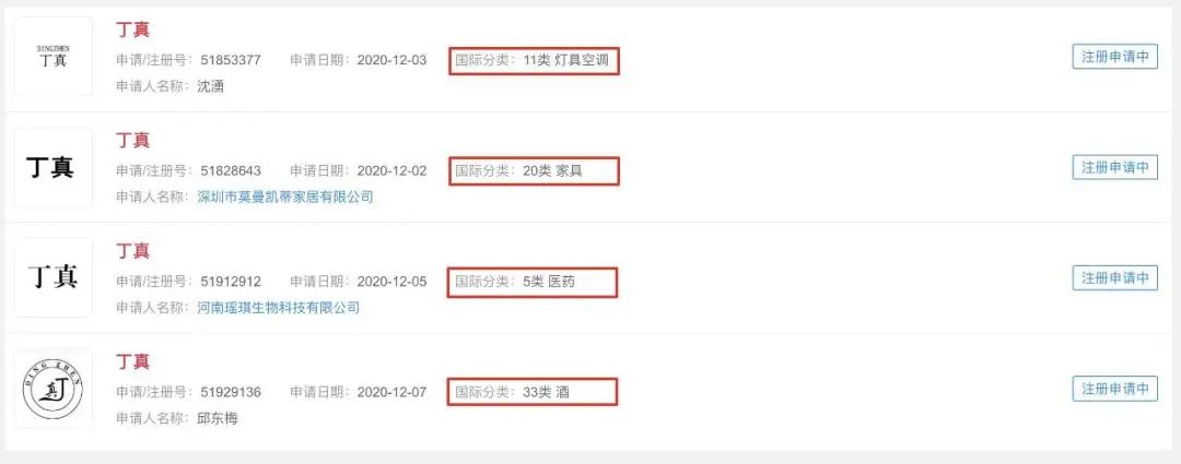 像上文提到的「丁真」商标,其中就不少是这种伎俩。就算文字商标被驳回,但多项图形商标、偏门类别商标仍旧处于申请中状态。
