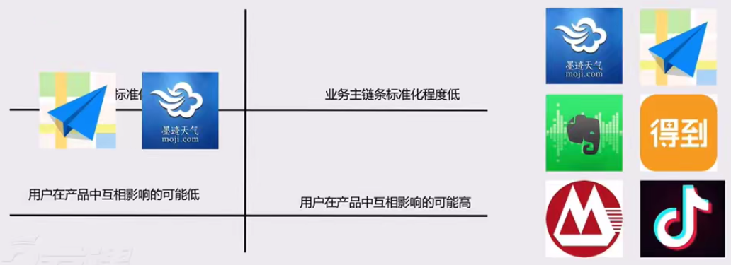 所以在业务主链条标准化程度上可能会低一些,但是并不存在用户互相影响的可能性,印象笔记毕竟还是一个工具,用户和用户之间是不可见的,所以印象笔记应该被放到坐标的这个位置上面,主链条标准化程度低,用户不存在互相影响。