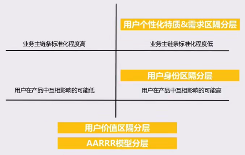 第一类方式是根据用户个性化特质或者用户的个性化需求来对用户进行区隔分层,这样的分层方式就比较适合应用在业务主链条标准化程度低,用户的个性化需求比较多样,业务比较复杂的产品当中,这是第一类分层方式,它具体是什么后边会展开来讲。