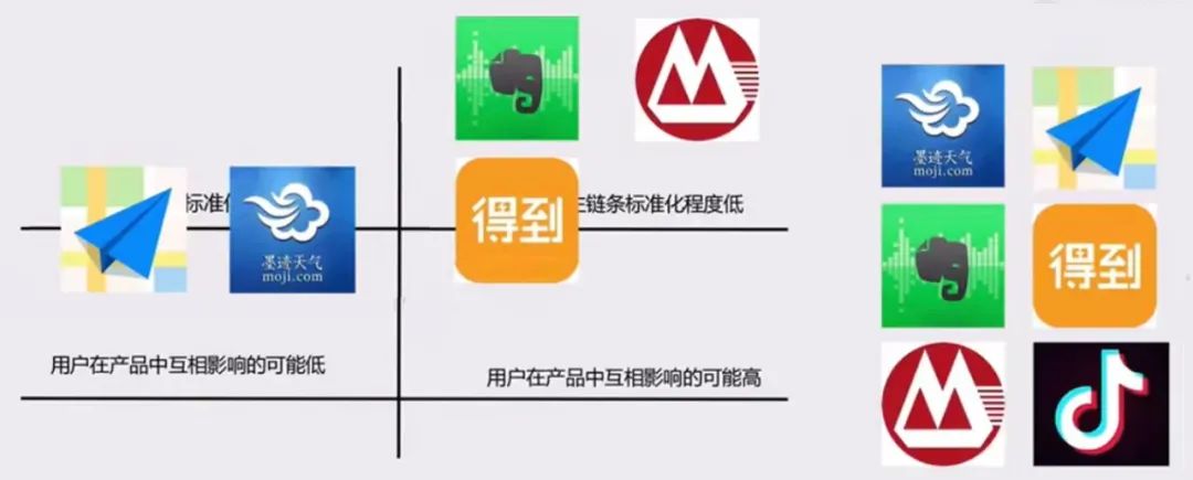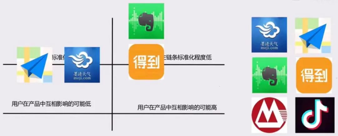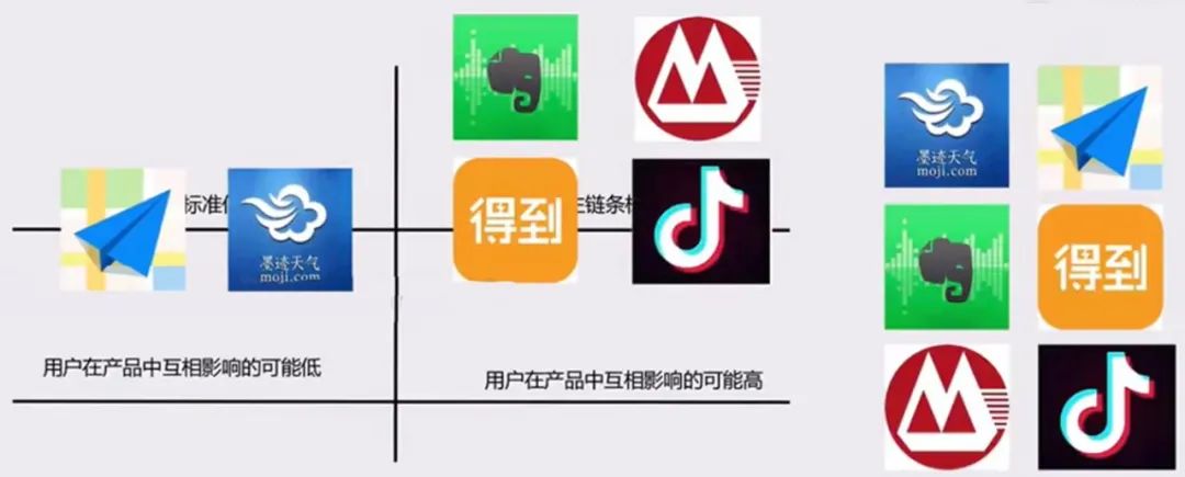 那么第二个维度是什么呢?就是用户在一款产品当中互相影响的可能性是高还是低。有一些产品的用户是会在这个产品当中发生关系的,有些产品用户可能就不会,包括同一类型的产品,可能用户互相影响的可能性也会不同。