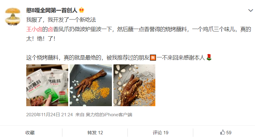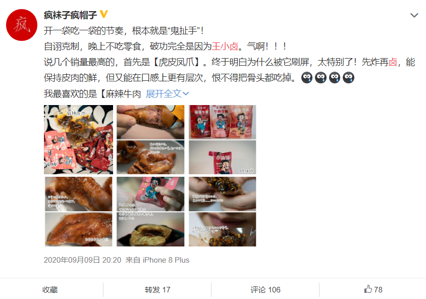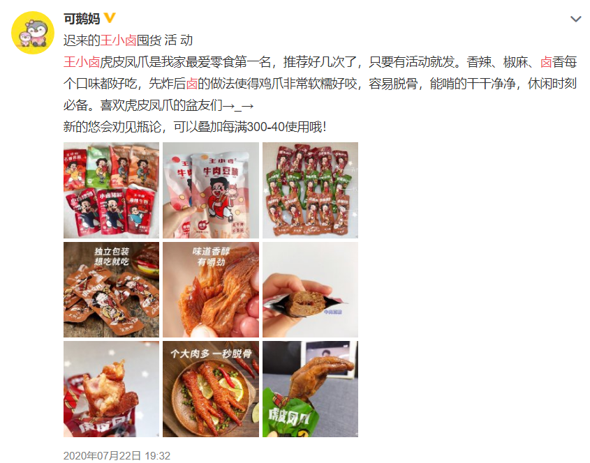 在微博上,达人们都会通过图文形式分享自己的生活片段,拉近与粉丝的距离,润物细无声的内容分享,能潜移默化的影响用户心智,帮助品牌迅速被普通用户所熟知,王小卤虎皮凤爪能被众多消费者熟知,离不开KOL、KOC们生活化内容种草。