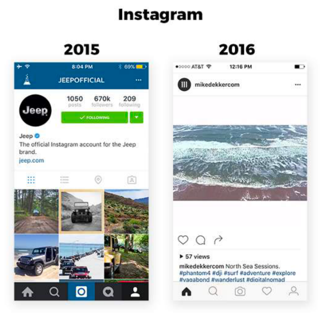 ins的前后改版,去除了平时常⻅的蓝⾊背景,运用黑白灰,通过字体字重凸现整体层级,让功能更加清晰!
