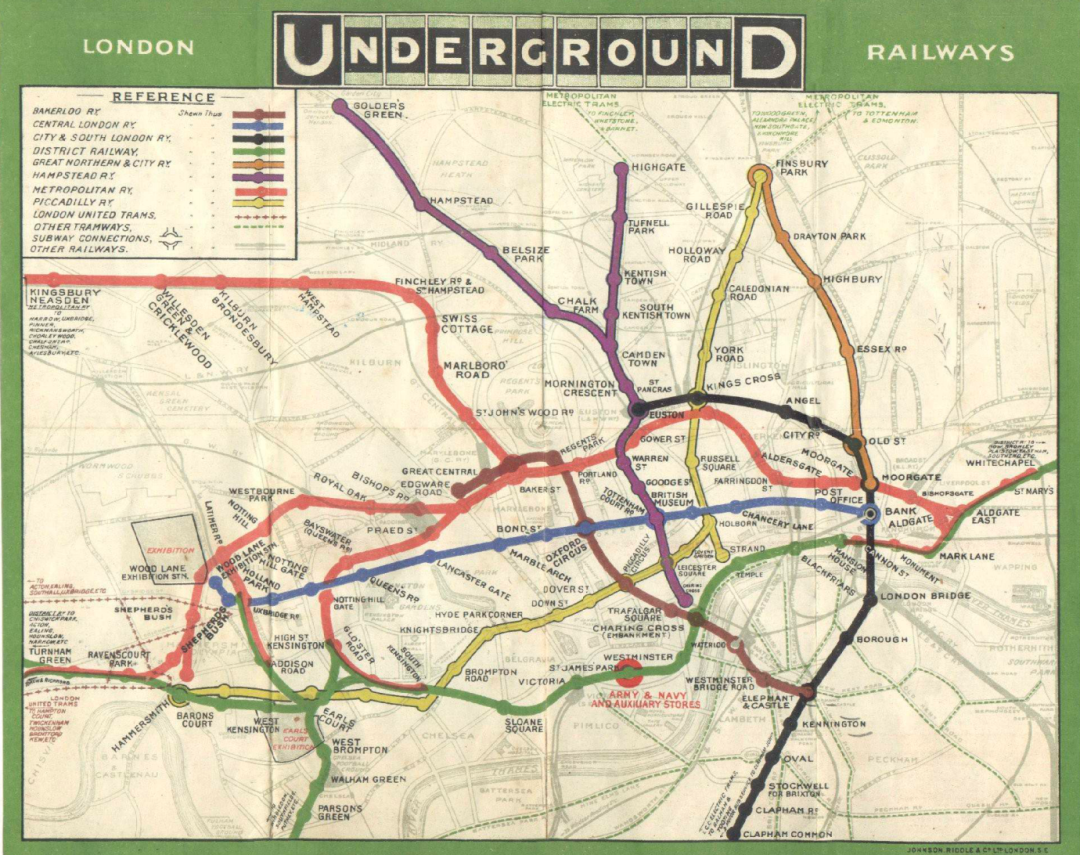1933年,世界上地铁地图是⻓这样,设计师们将每个地⽅精确的绘制在地图上,很合理!但是识别起来特困难。