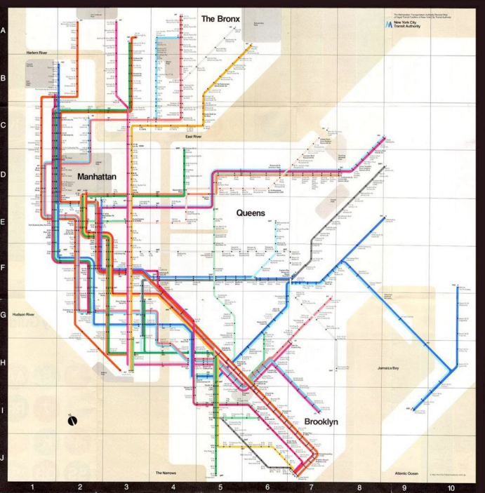 1972年美国纽约地铁图,地铁线路图开始变的很清晰,因为有⼈觉得⽤户不需要100%知道地图上每个详细的地⽅,⽤户只需要关注地铁线路即可。
