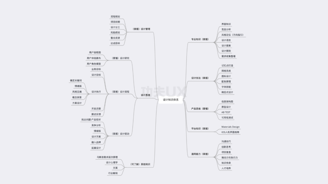 比如,UI设计专业知识了解多少?常用的设计技法有没有掌握?标准化设计流程又是怎样的?我想,估计很多设计师还很模糊。下面来看一张图,就能明白了。