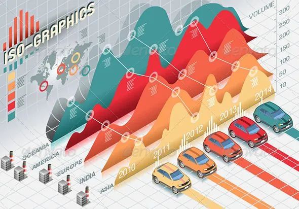 1. 扁平风,用几何图形设计图表,再搭上鲜艳、明亮一点的色彩,这种图表看起来很时尚。