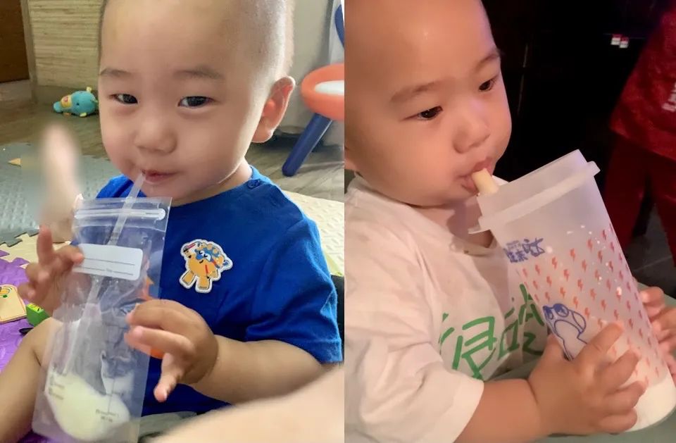 于是,就有他爹的解决方案:同样的牛奶冲好之后,装进塑料袋子、饮料杯子里,再给他配一根吸管。