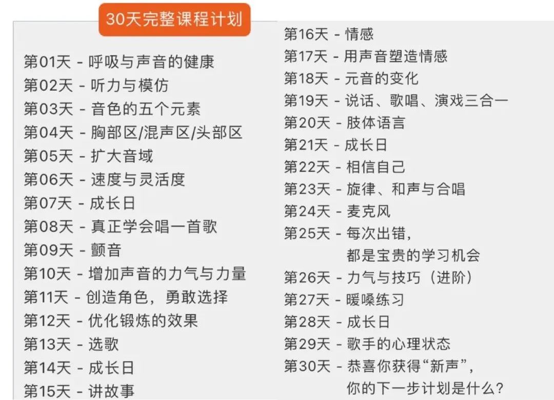 30天的学习,每天都有不同的内容,比如呼吸、发声、颤音、情感、表演甚至包括心理等等。