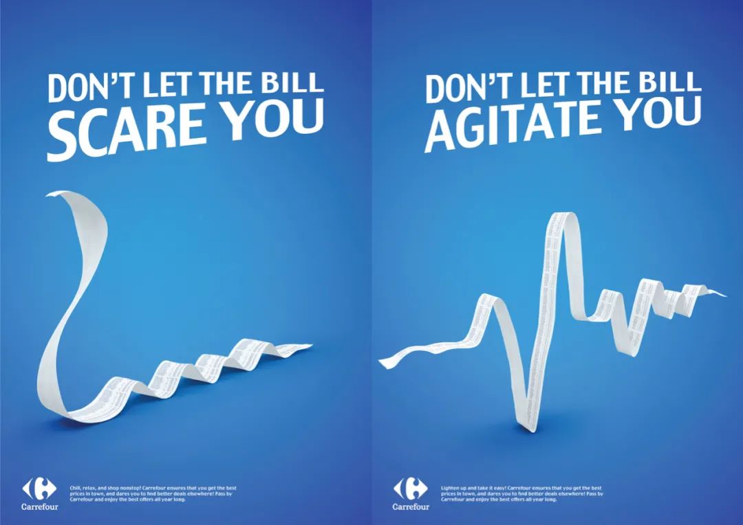 Carrefour家乐福广告,不要被账单吓到don't let the bill scare you、不要让账单扰乱你don't let the bill scare you,两幅海报,利用账单和毒蛇及心电图的相似点来诠释主题。