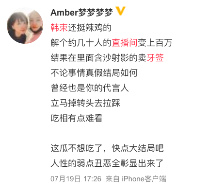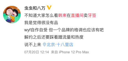 大叔认为,韩束第一个解约吴亦凡,这个决策是明智的,不仅止损,更是赚了一波好感。但在官方直播间里卖牙签,对品牌很减分。踢完,再去踩一脚,有损品牌声誉。