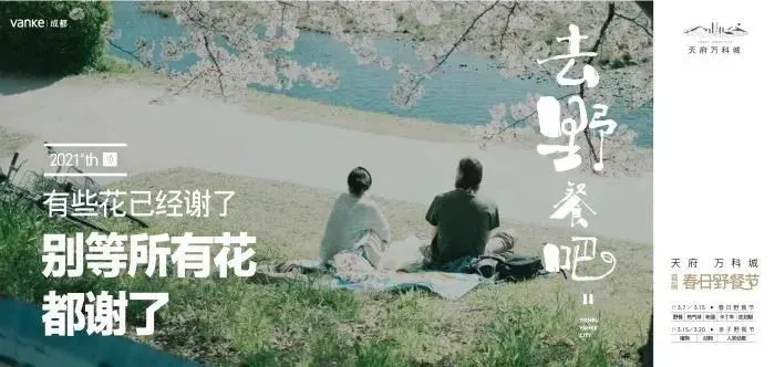 文案出自万科春日野餐节的宣传海报。在忙碌的城市生活中,花开花谢是许多人已无暇顾及的美好。这句文案不仅写出了那份错失美好的遗憾,更充满了追求美好的号召力。