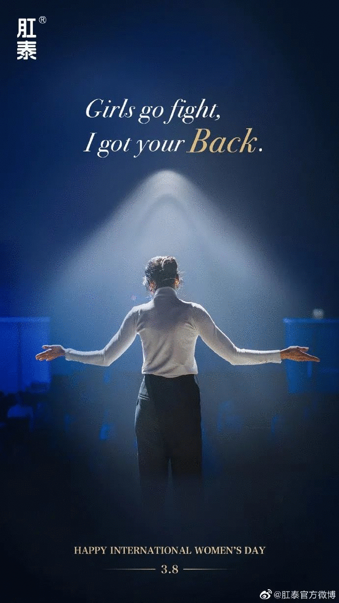 文案出自肛泰妇女节借势海报,“女孩们往前冲!你的后面交给我。”肛泰很喜欢玩一语双关,但这样的文字游戏仍然很有趣。
