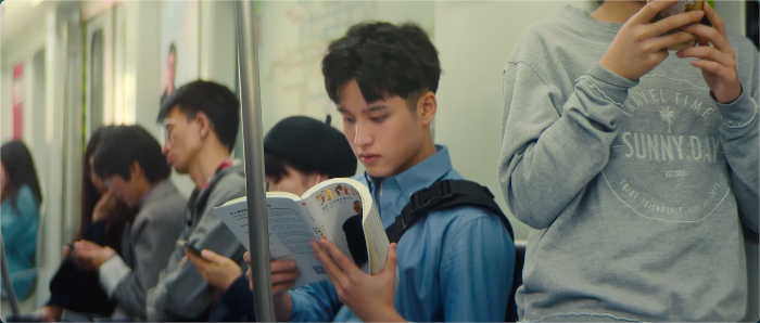 出自京东图书在世界读书日推出的广告,通过9位正在读书的人以及其当下所处的阅读环境最终道出“世界在你眼中”这一短片主题。“低着头向上看”这句文案是整套宣传里的亮点。