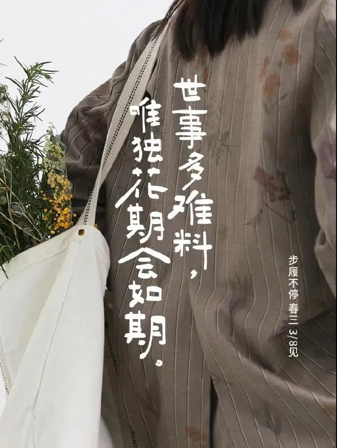 步履不停的文案拥有许多文案人都喜欢的浪漫、文艺,这句文案也充满了这一风格。用“世事难料”和“花期如期”做对比,让人在消极中看到了生活的美好。