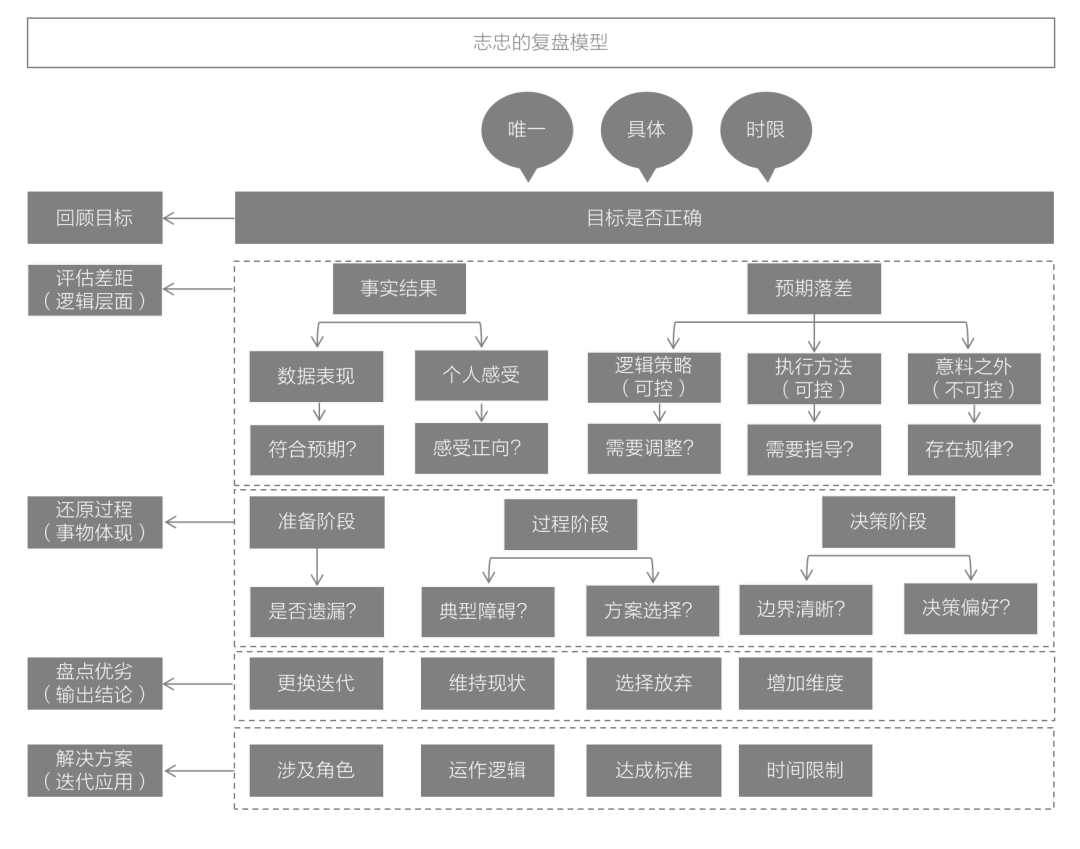 上图是联想设计的复盘模板,我个人认为这套模板的作用比较偏行动管理的层面,适合你在日常中使用。在这里就不展开介绍了。