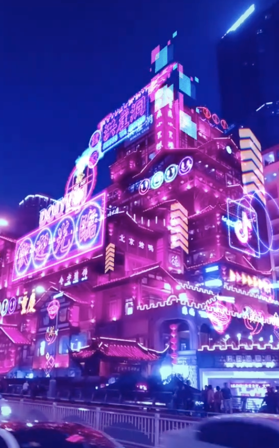 抖音为西安打造了“凤飞钟楼”的AR特效,用户在景点前扫描就能在屏幕中看见凤凰飞出钟楼的虚拟动画。在重庆洪崖洞,则是赛博朋克风,吸引众多用户前去打卡。