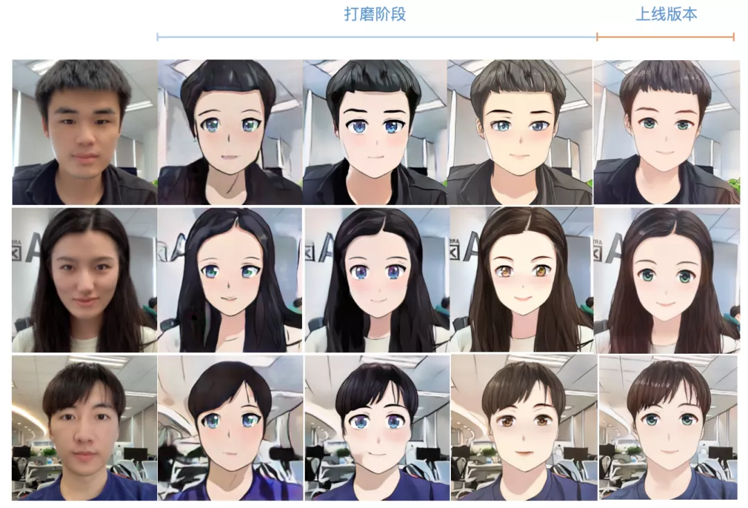 接下来,需要借助计算机视觉中一类常用的神经网络GAN(Generative Adversarial Network,生成对抗网络)。GAN中包含一个生成器和判别器,简单来说,生成器负责画漫画,判别器负责审核,双方互相磨合,逐渐接近目标效果,其整体也就学会了自动生成。为了优化出最佳的效果,团队更新迭代了1000多版,“最夸张的时候公司有几百张显卡在同时跑这个试验”,抖音设计中心负责人王运恢在一次抖音技术开放日活动上分享。