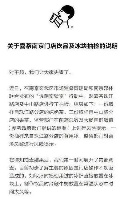 去年喜茶连续7个月发生5起食品卫生安全问题,奶茶中被检出菌落总数超标,主要原因是门店操作不规范造成的,如冷藏牛奶放在常温状态中太久等,后续是道歉,整改: