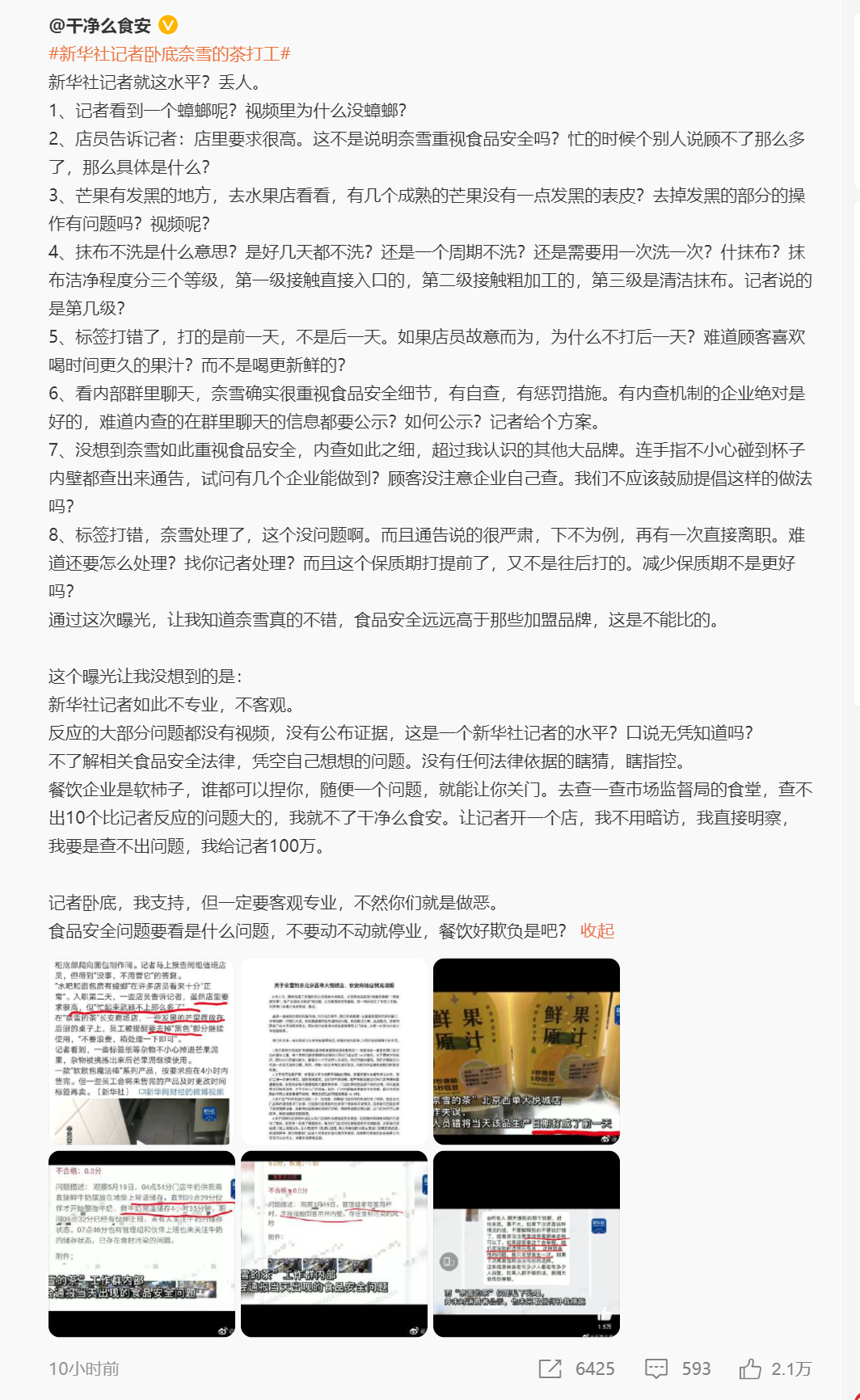 虽然很多网友替奈雪抱不平,人家也很重视食品安全细节啊,每天公示内查结果,连内壁检查出指纹都通告,试问几个企业能做到?