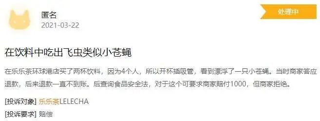 乐乐茶不止一次被投诉在奶茶中发现异物,包括飞虫、塑料袋、睫毛等: