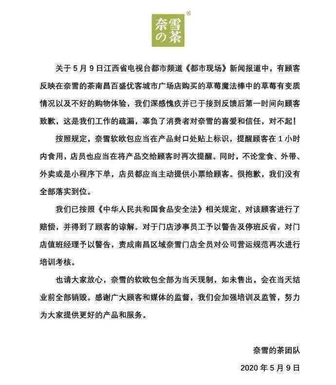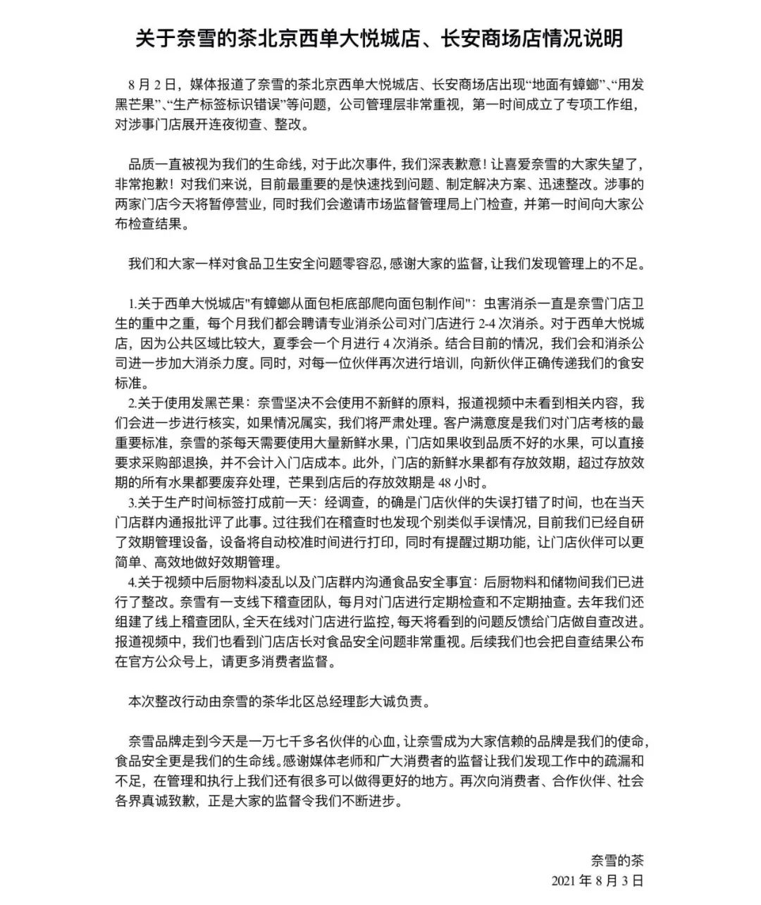 问题爆出以后,奈雪的茶很快就在次日凌晨5点发了道歉声明,并承诺对这两家店进行停业整改: